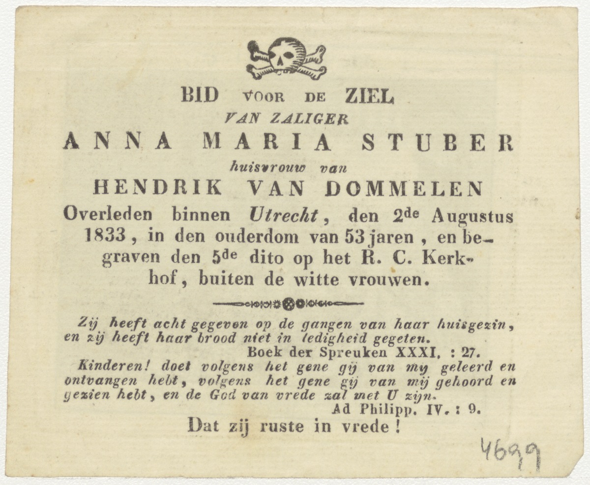 Elizaas voorspelling vervuld, kz. Bid voor ziel Stuber-van Dommelen (+1833) Utrecht