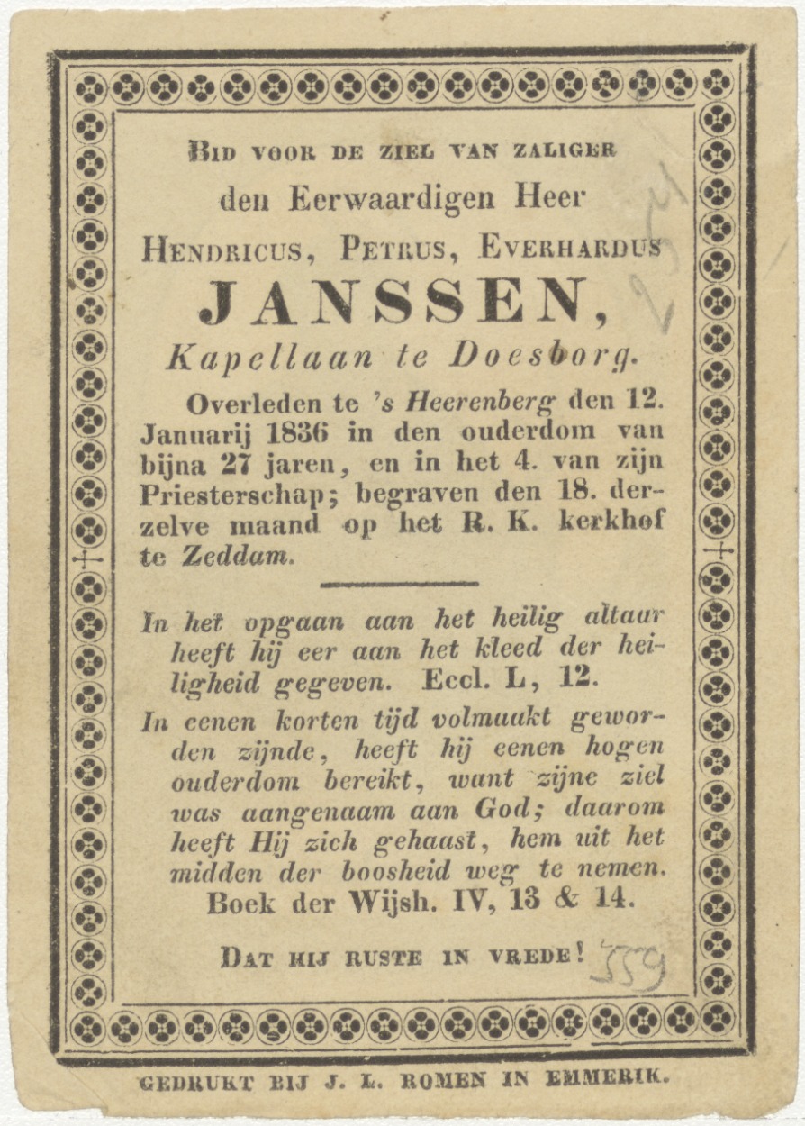 H. Stephanus, kz. Religieus;Bid voor ziel Janssen (+1836);kapellaan Doesburg