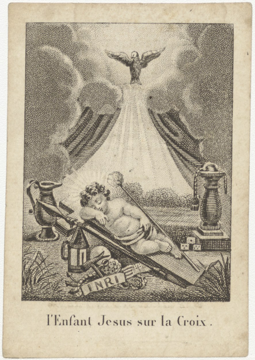 Christuskind slapend op kruis, waaromheen martelwerktuigen, kz. Bid voor ziel Dobbe (+1830);Sassenheim