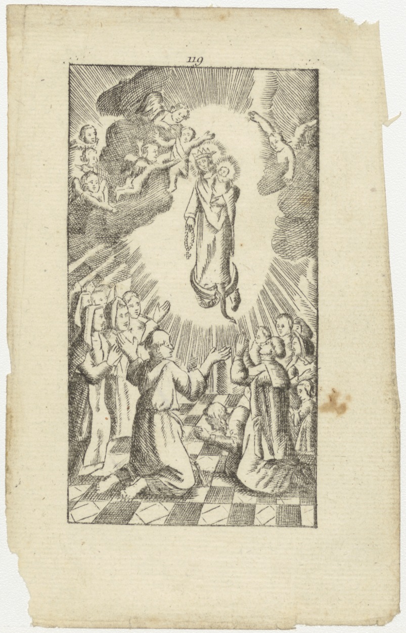 Verschijning van H. Maagd met Christuskind staande op halve maan en omgeven door engelen
