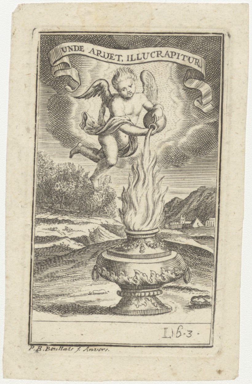 Goddelijke liefde: vaas in landschap, achtergrond een stad, daarboven engel, olie uitgietend