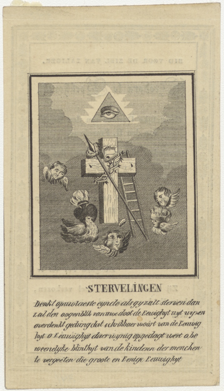 Kruis met martelwerktuigen, met alziend oog, vlammend hart, cherubs en een haan, kz. Religieus;Bid voor ziel Theodora te Boekhorst (+1836);Geestelijk Dochter Regel H. Franciscus