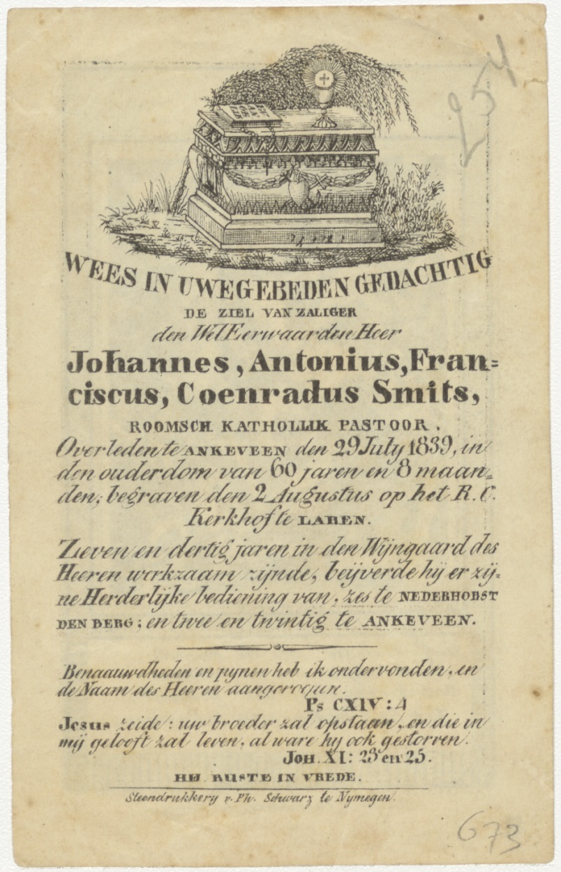 Christus verrijzenis, kz. Religieus;Bid voor ziel Smits (+1839);R.K. pastoor;Ankeveen