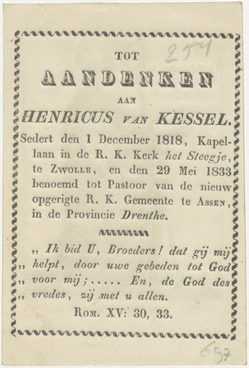 H. Suitbertus, kz. Herinnering aan Henricus van Kessel;kapelaan het Steegje;Zwolle;1833