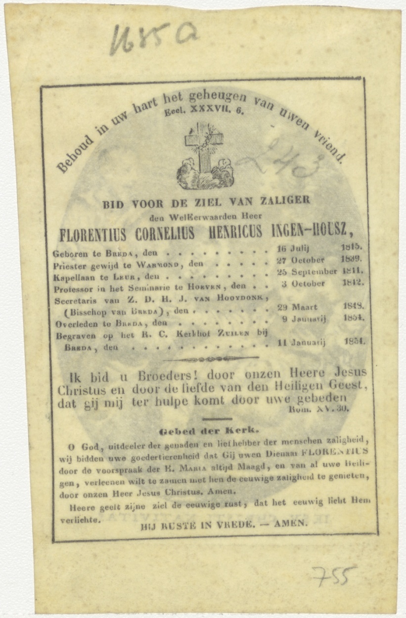 Aanbidding der herders, kz. Religieus;Bid voor ziel Florentius Cornelius Henricus Ingen-Housz (+1854);prof seminarie;Breda