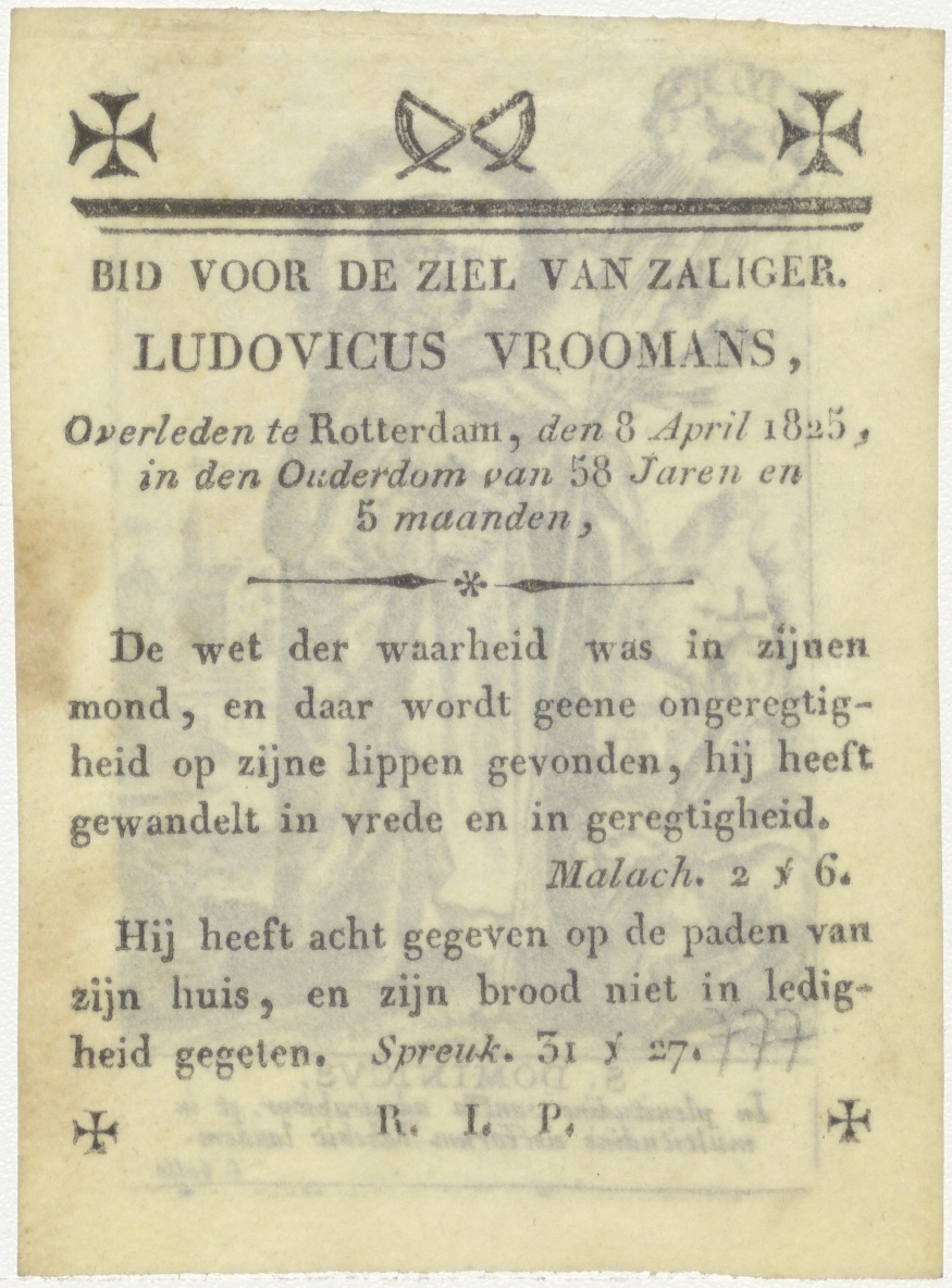 H. Dominicus, kz. Bid voor ziel Vroomans (+1825);Rotterdam