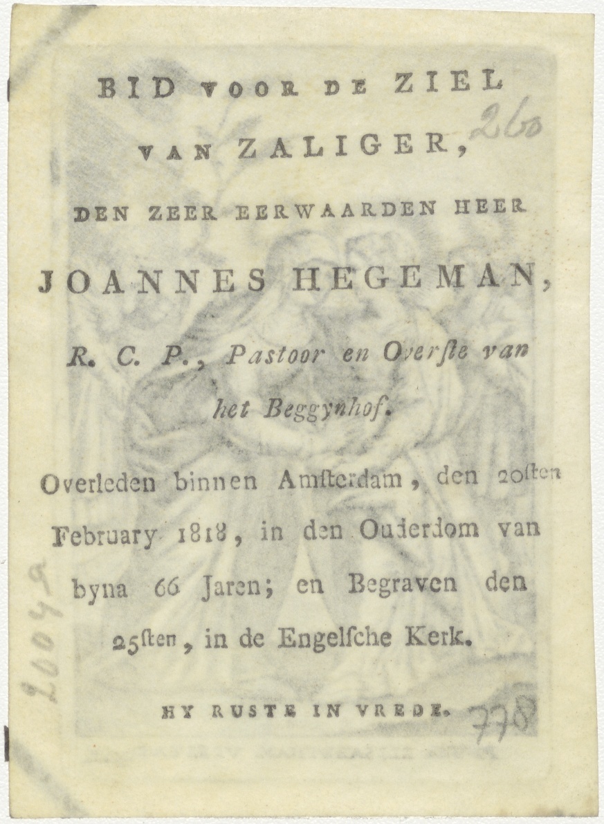 Visitatie, ontmoeting Maria en Elisabeth, kz. Religieus;Bid voor ziel Hegeman (+1818);pastoor en overste Begijnhof;Amsterdam