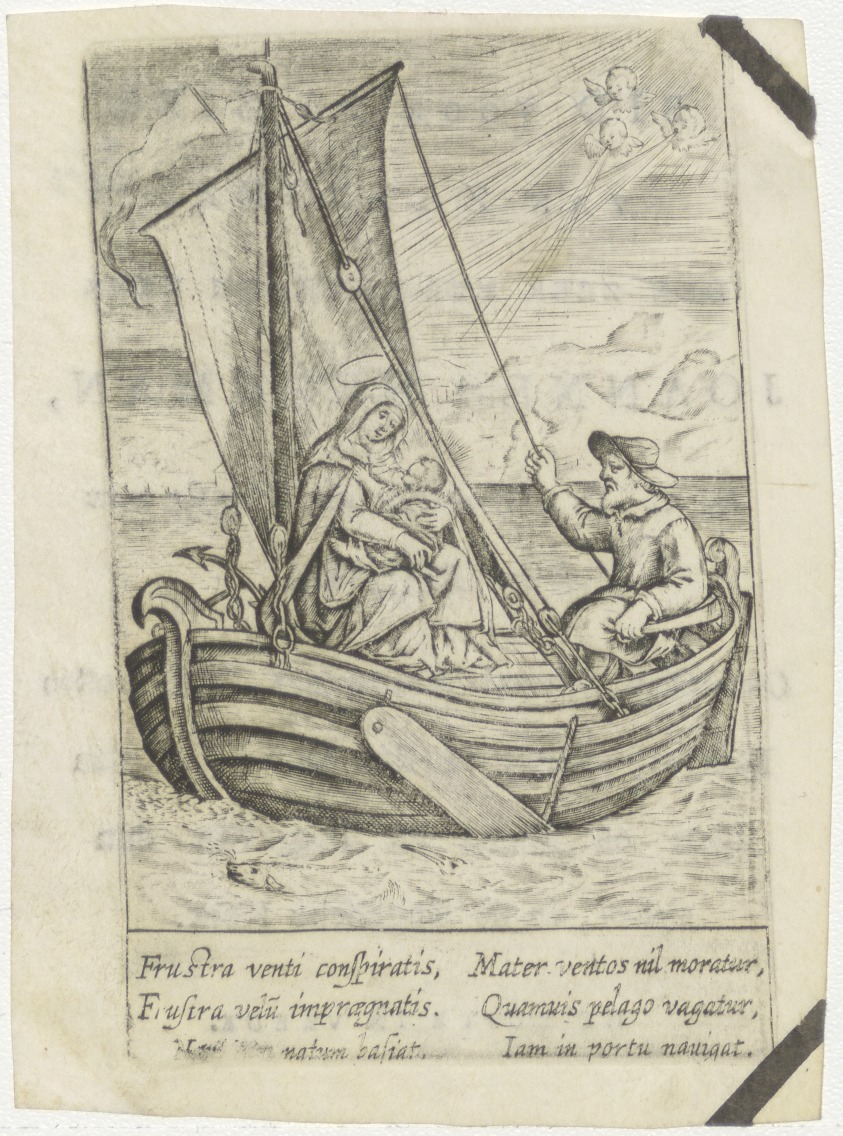 H. Familie in een bootje tijdens vlucht naar Egypte, kz. Religieus;Bid voor ziel Joannes Hegeman (+1818);pastoor en overste Begijnhof;Amsterdam