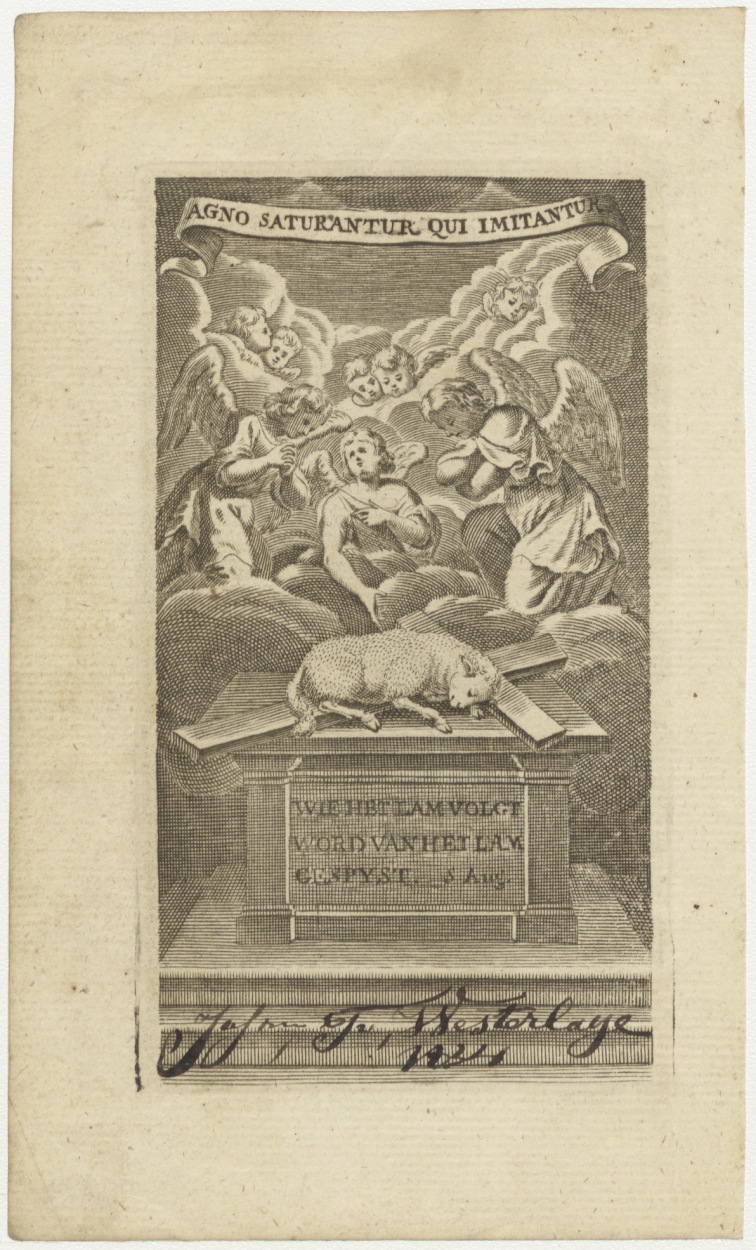 Het Lam Gods: Het Lam Gods slapend op een kruis, op altaar, daarboven engelen