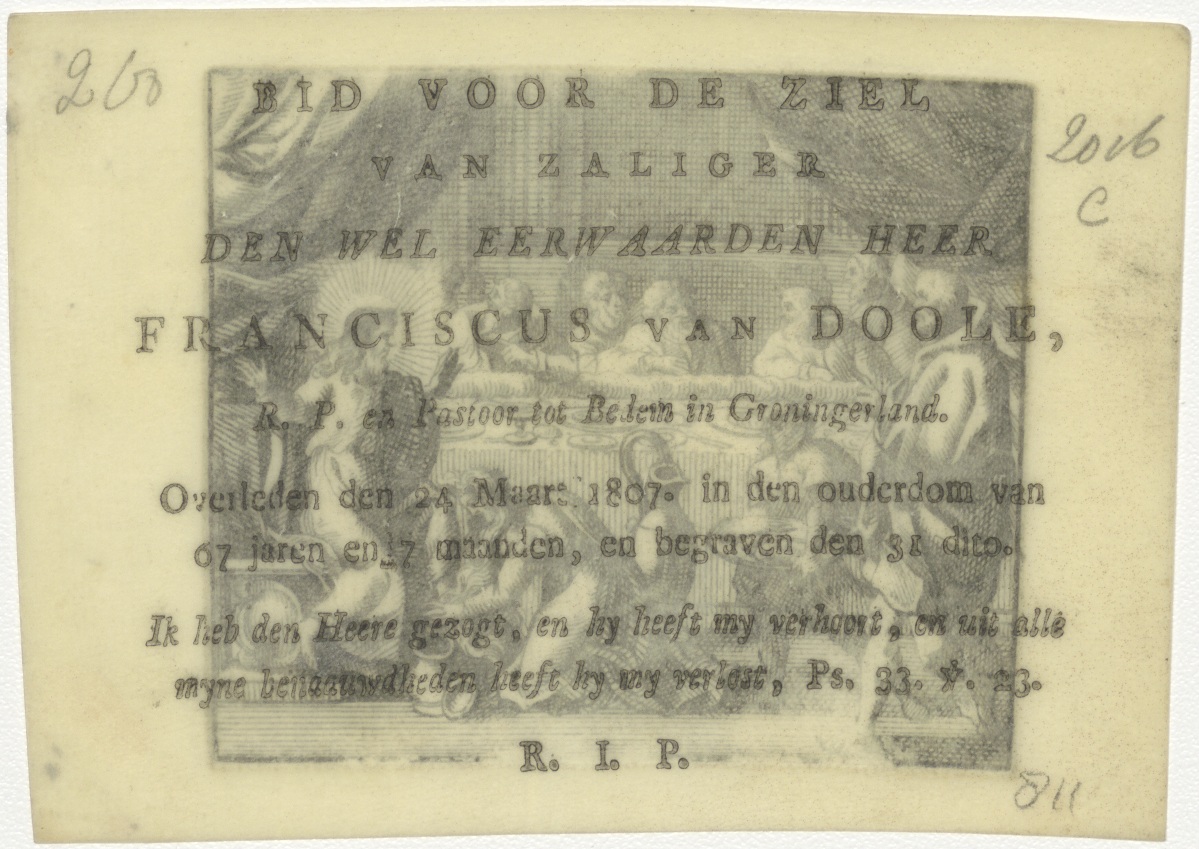 Magdalena zalft de voeten van Christus, kz. Religieus;Bid voor ziel Franciscus van Doole (+1807)
