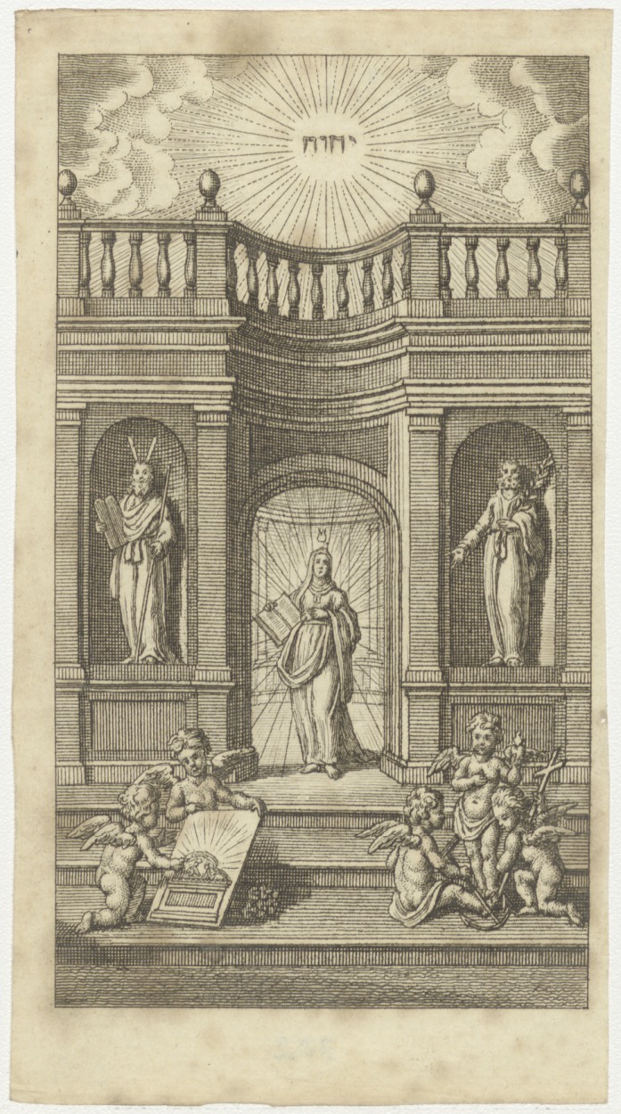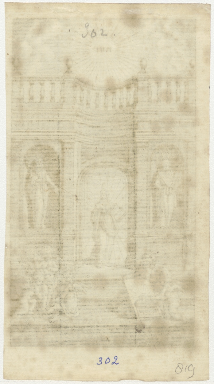 Het Geloof: een vrouwenfiguur staande in de poort van een gebouw, zij houdt een boek in de hand, etc.