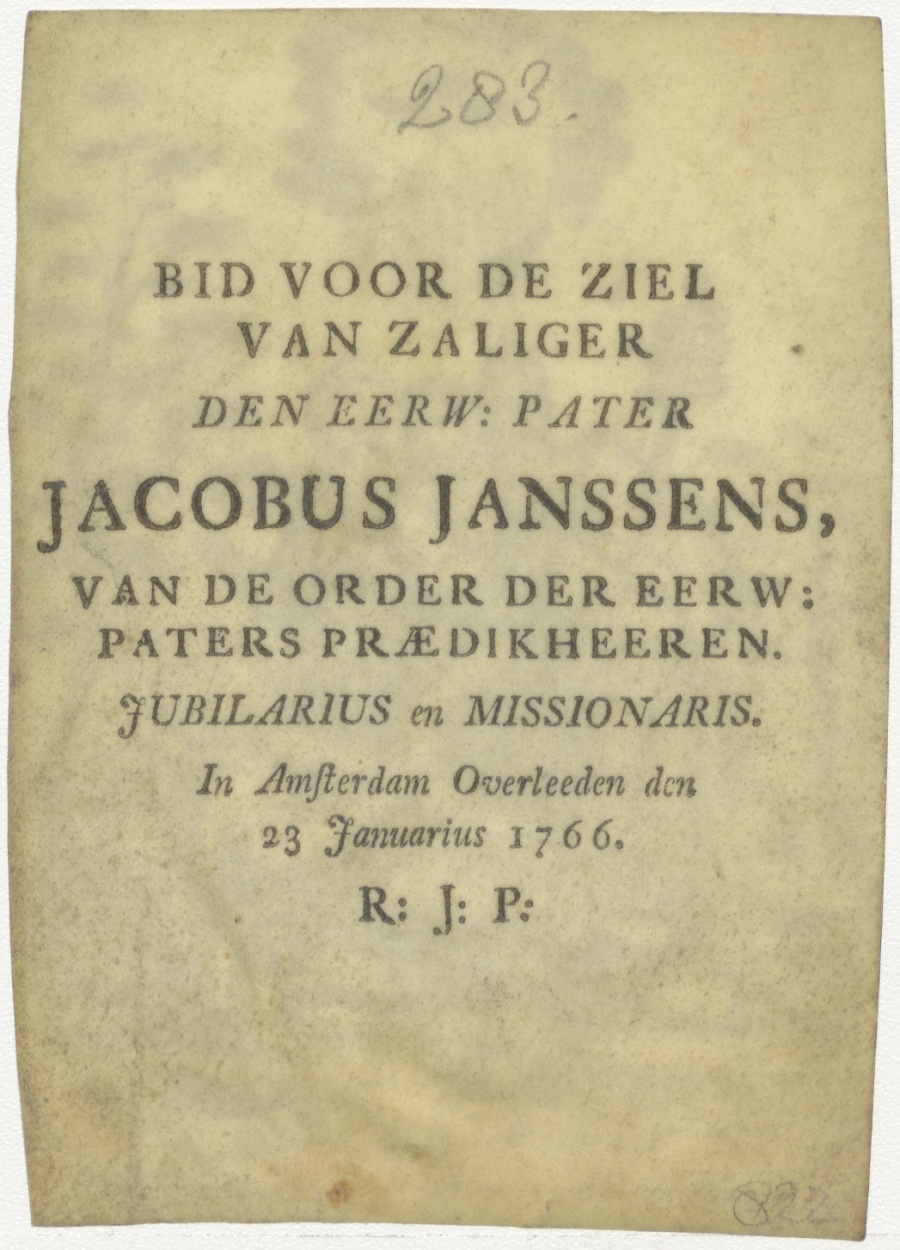H. Alexius, kz. Religieus;Bid voor ziel Jacobus Janssens (+1766);pater predikheeren;missionaris;Amsterdam