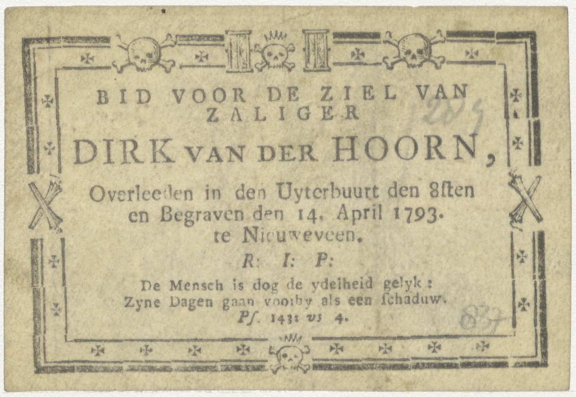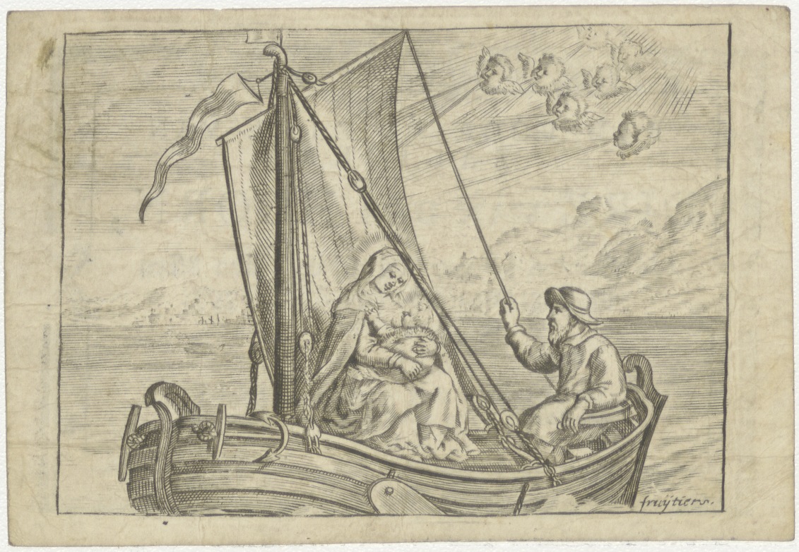 H. Familie in een bootje tijdens vlucht naar Egypte met putti die de wind in het zeil blazen, kz. Bid voor ziel Van de Hoorn (+1793);Nieuweveen