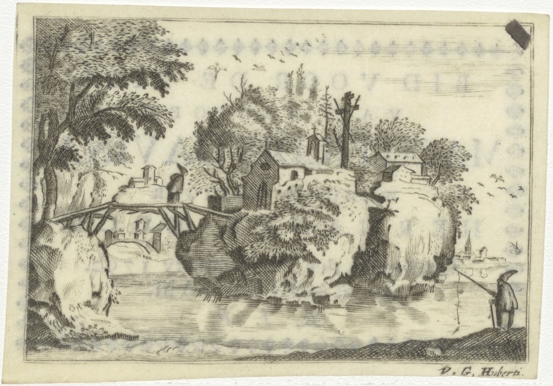 Landschap met een klooster op een rots, met brug waarop monnik en rechts monnik met hengel, kz. Bid voor ziel Machtildis Davina (+1792), Amsterdam, weduwe van Hermanus Kock
