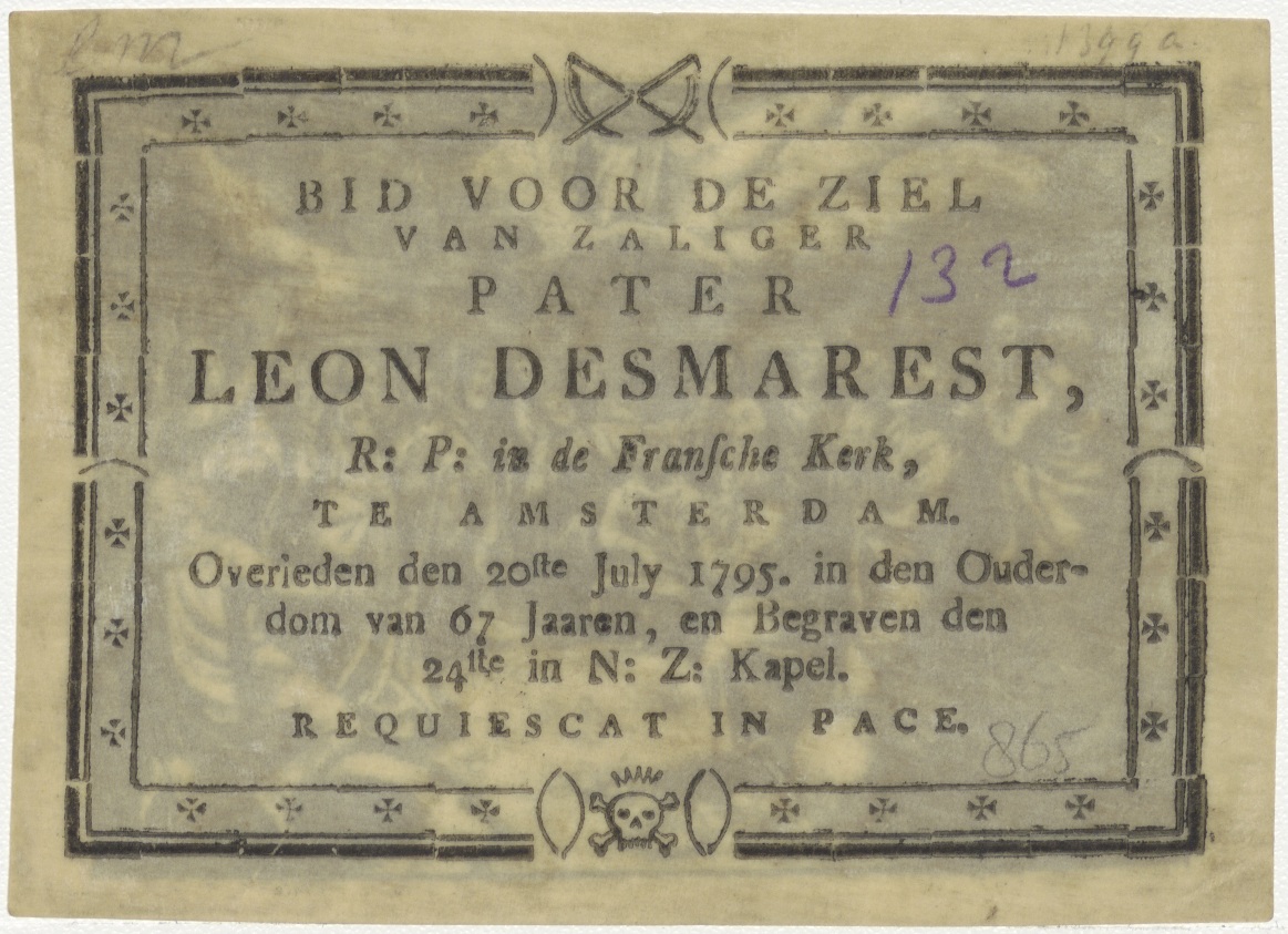 Hemelvaart van Christus, kz. Religieus;Bid voor ziel Leon Desmarest (+1795);R.K. pastoor Franse Kerk;Amsterdam