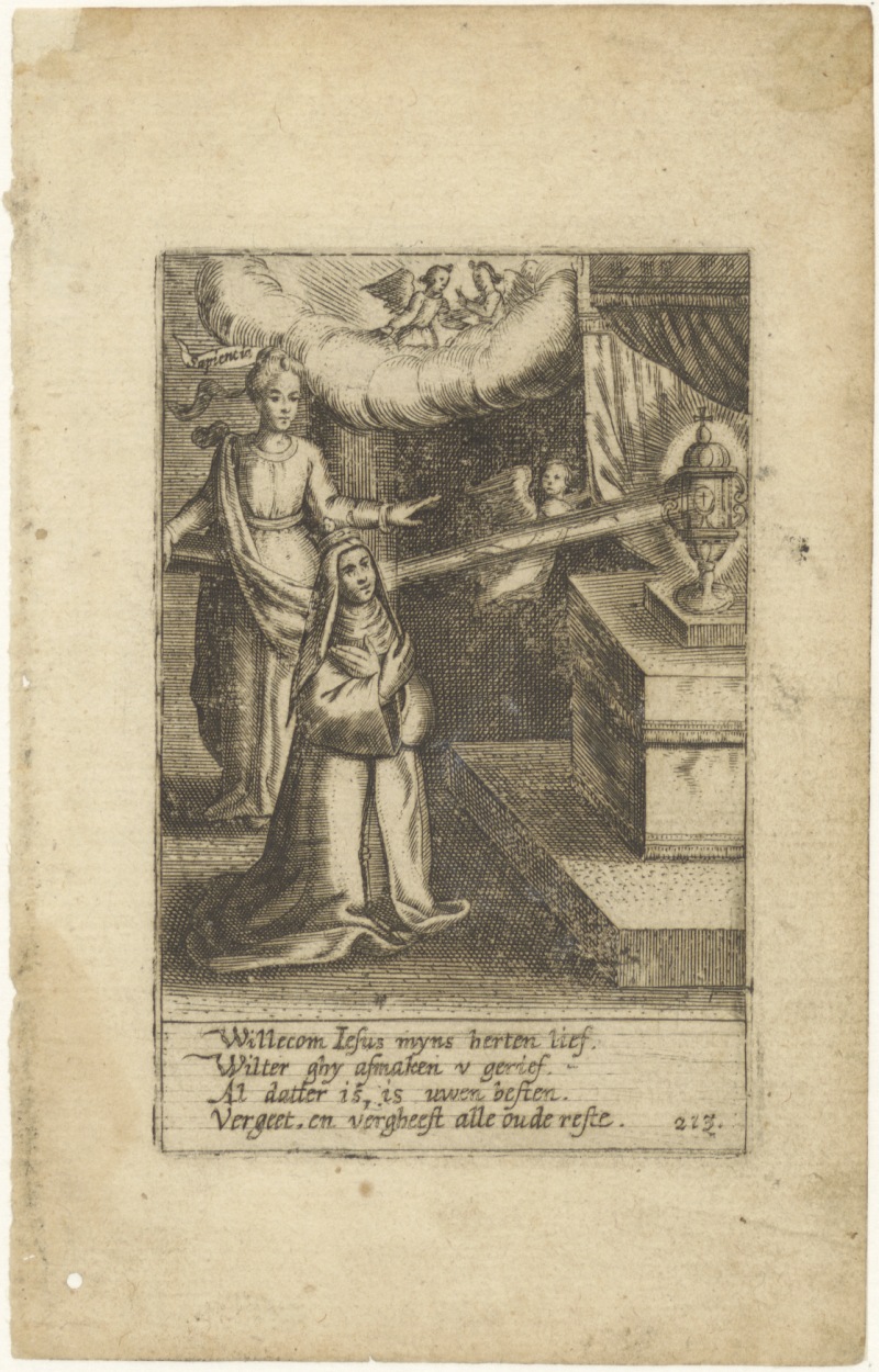 Allegorie: Een bruid knielend voor 't Allerheiligst Sacrament in monstrans, bijgestaan door Sapientia, met "Willecom Jesus mijns herten lief ..."