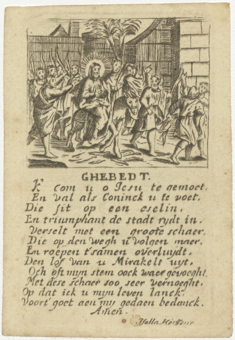 Palmpasen, intocht van Christus in Jeruzalem, met "Ghebedt, k' com u o Jesu te gemoet, en val als Coninck u te voet . ..."
