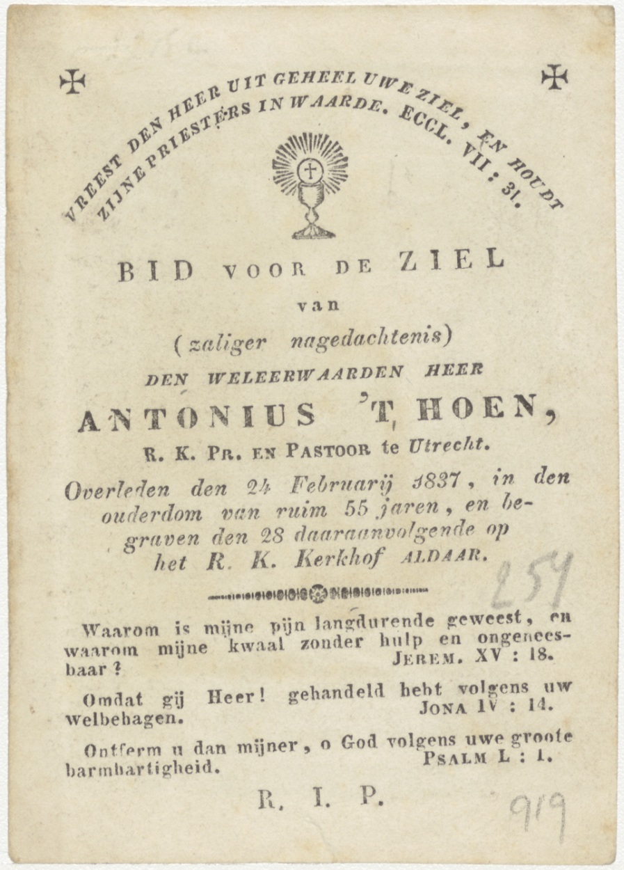 H. Antonius, abt, kz. Religieus;Bid voor ziel Antonius 't Hoen (+1837);R.K. pastoor Utrecht