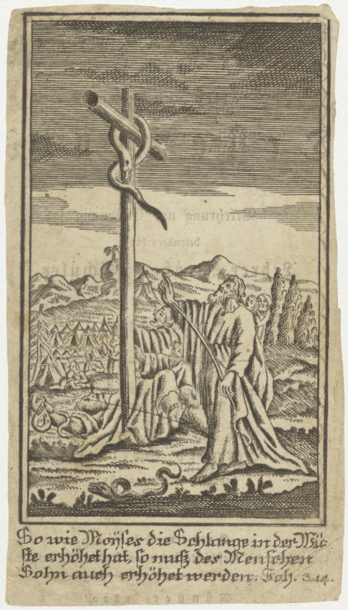 Mozes plaatst de koperen slang in de woestijn