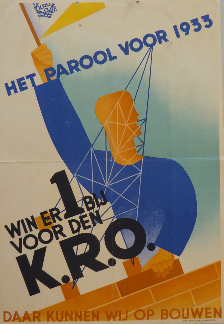 Affiche van de KRO met metselaar, met "Het parool voor 1933 Win er 1 bij voor den K.R.O."