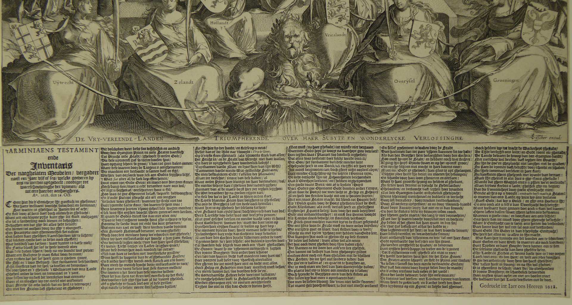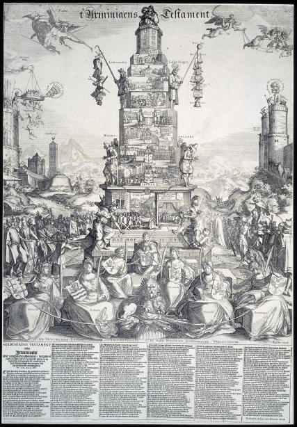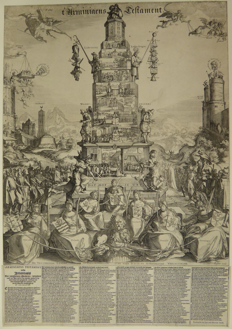 Centraal staat een toren waarop een non met rozenkrans en boek in de hand zit. Zij verbeeldt het 'Misverstand' en kijkt door de vingers. Onder deze non zijn de wapens van diverse remonstrantse steden afgebeeld gevolgd door enkele 'cristallijne brillen'. Van boven naar beneden worden in negen taferelen gebeurtenissen uit de bestandstwisten in de belangrijkste ...