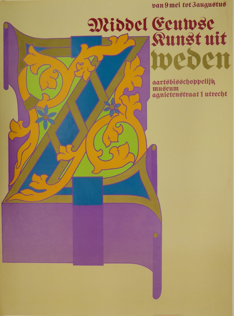 Affiche met tekst tentoonstelling Middeleeuwse kunst uit Zweden, ABM, Utrecht