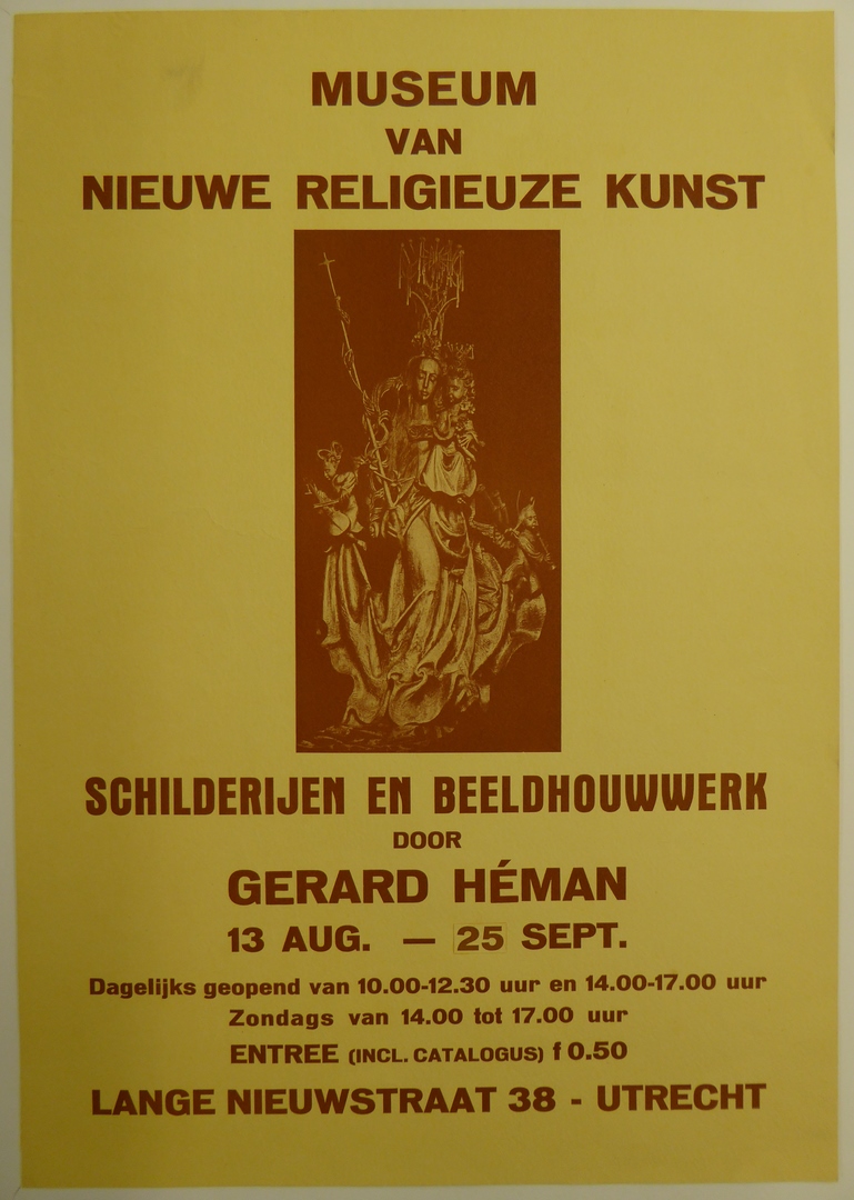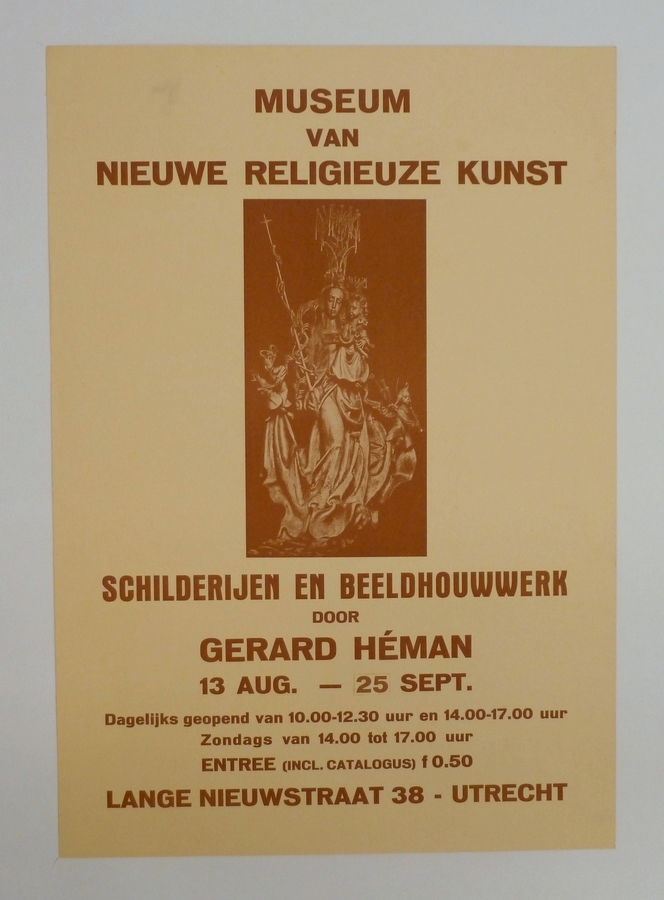 Affiche Museum van Nieuwe Religieuze Kunst, schilderijen en beeldhouwwerken door Gerard Héman, met Maria met kind geflankeerd door twee engelen (ABM bh656)