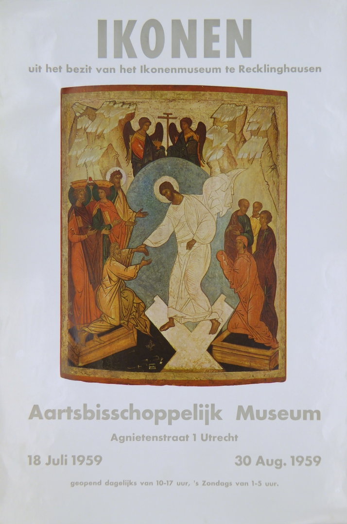 Affiche "Ikonen uit bezit van het Ikonenmuseum te Recklinghausen" waarop ikoon met verrijzenis