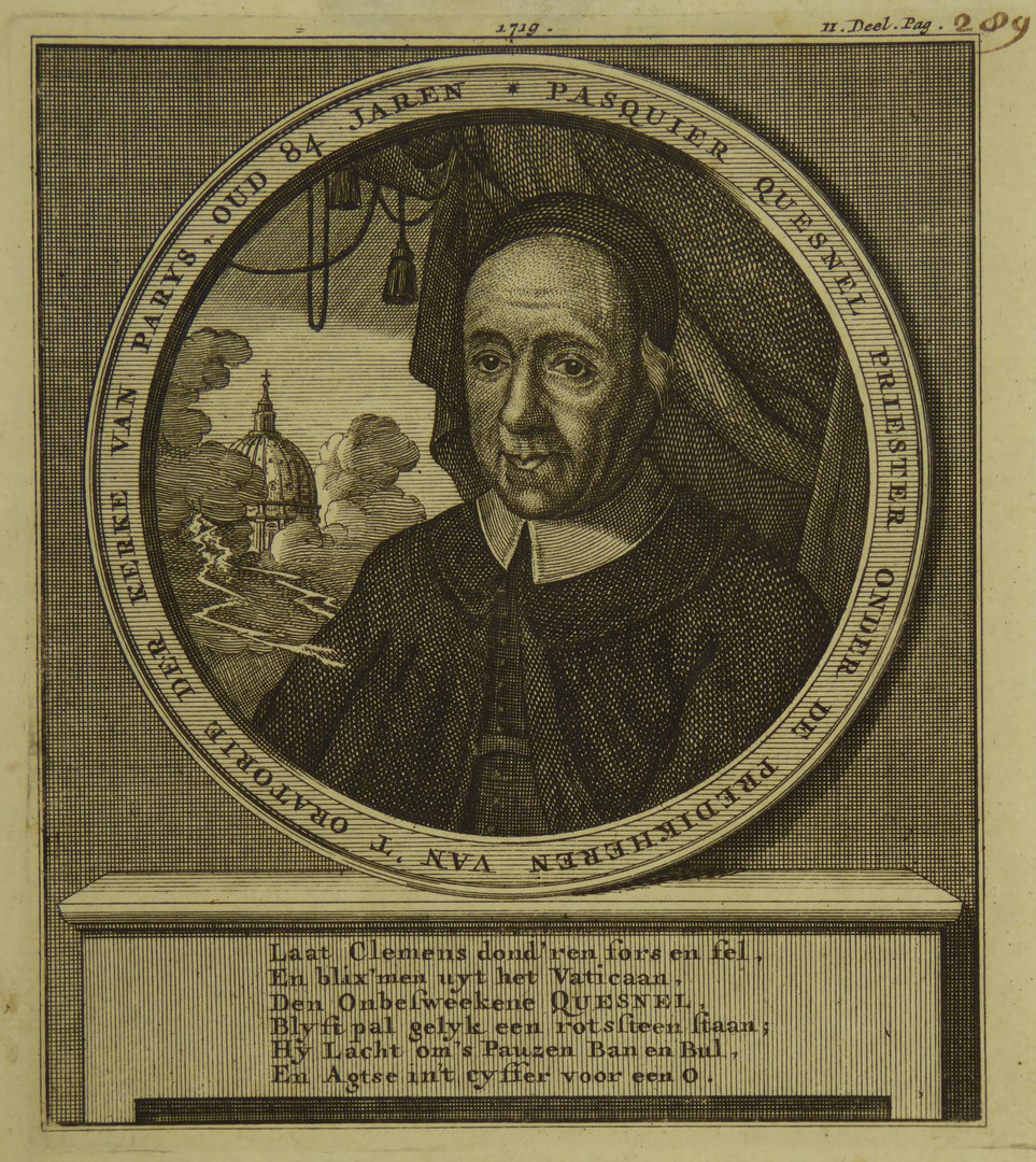 Portret van Pasquier Quesnel, met St. Pieter en zesregelige tekst