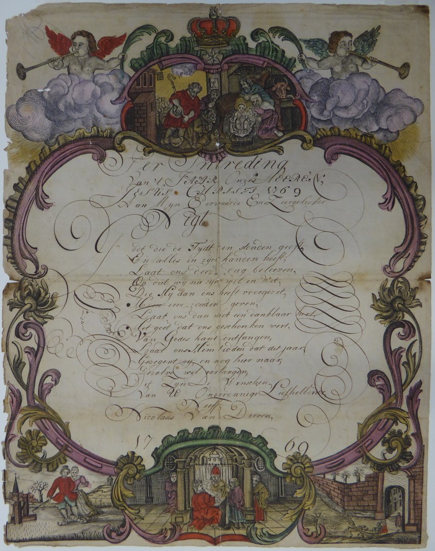 Handgekleurde gravure met o.a. aanbidding der herders en geschreven nieuwjaarswens voor 1769 van Nicolaas van Dieren aan zijn nicht