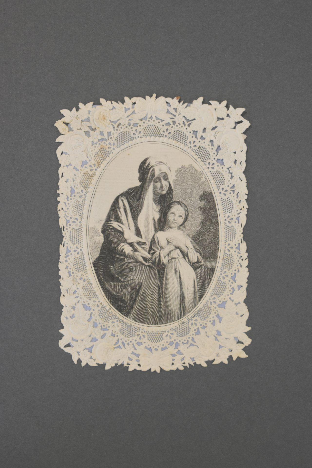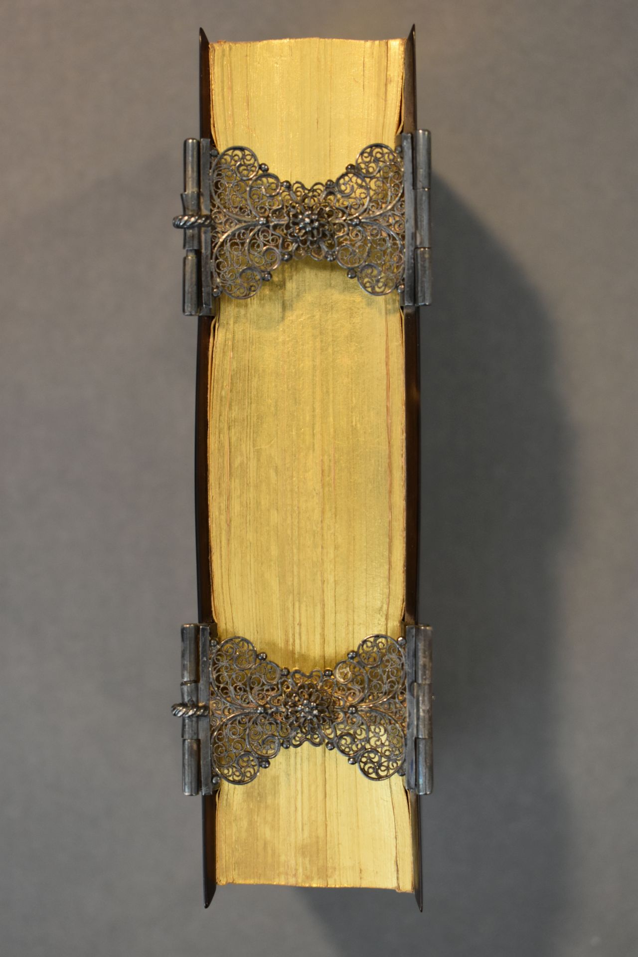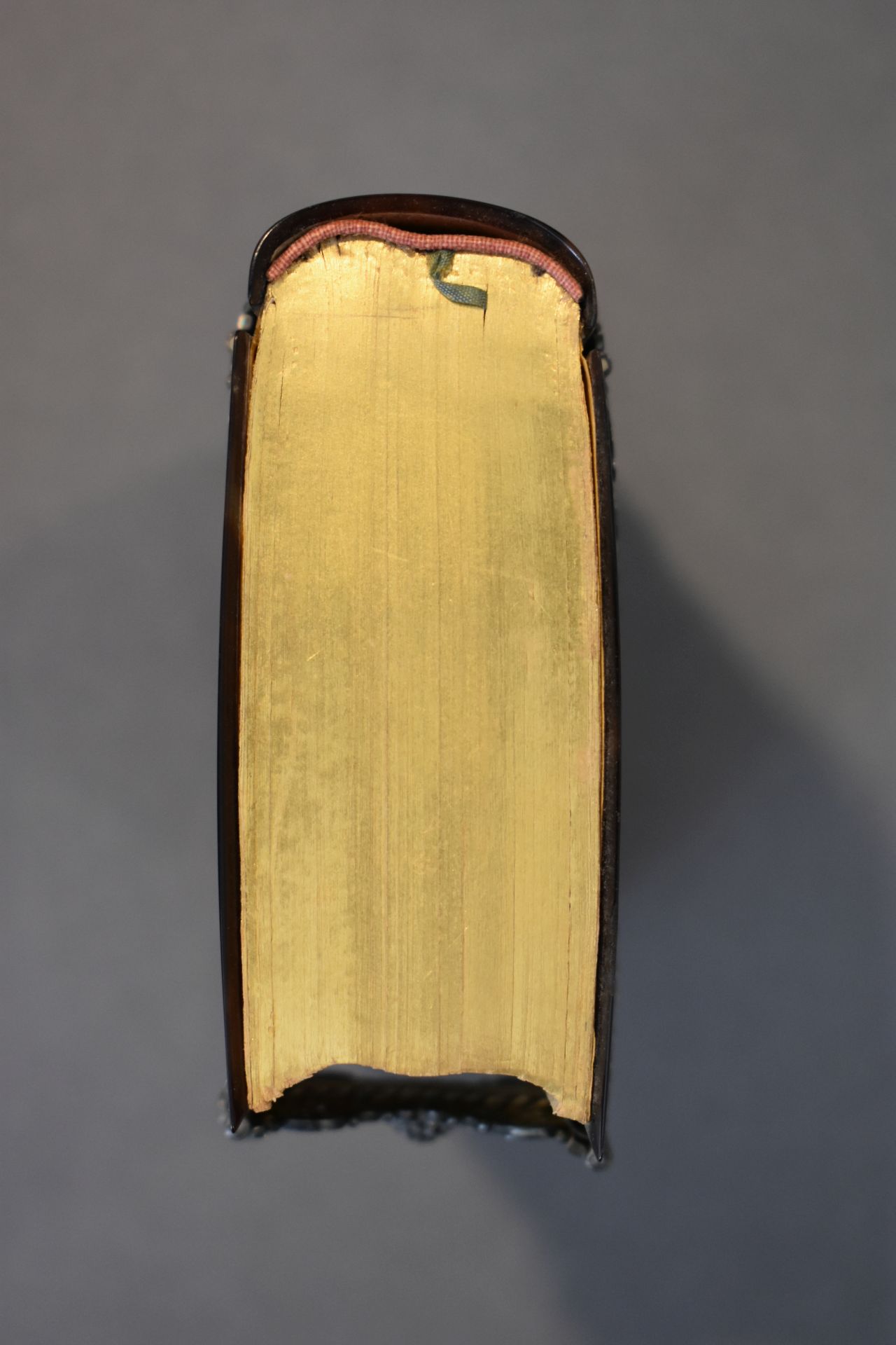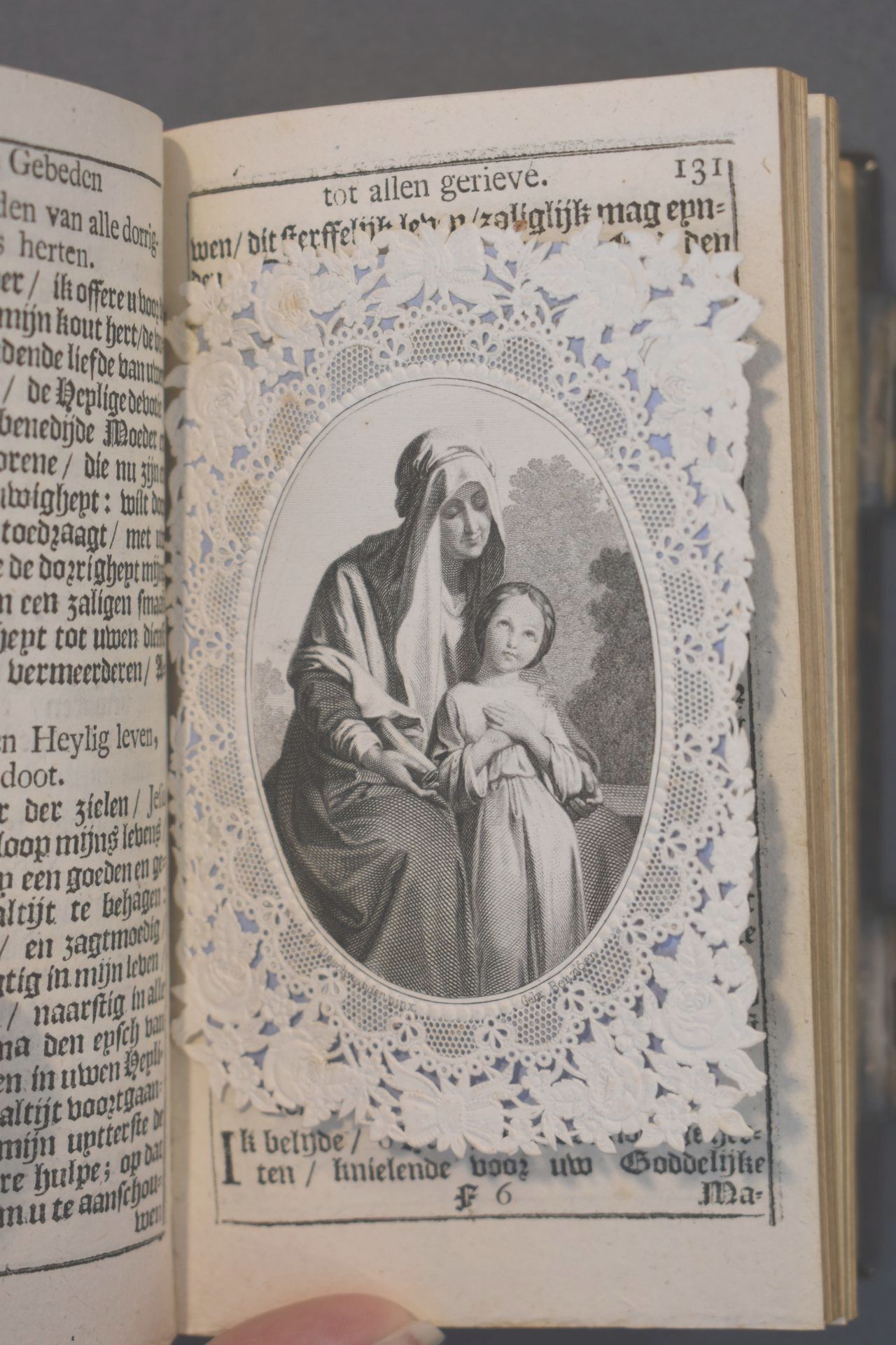 Het boek heeft een gegraveerde titelpagina die gesigneerd is met ‘A Starre, Fe’ en diverse gravures, het groene textiele leeslint is nog aanwezig, de dek- en schutbladen zijn nieuw en de snede is verguld. Tussen pagina 130 en 131 zit een machinale kantprent met op de witte voorkant, in een ovaal, Maria met kind, eronder ...