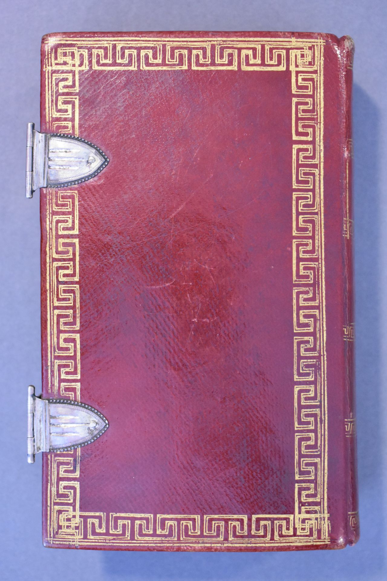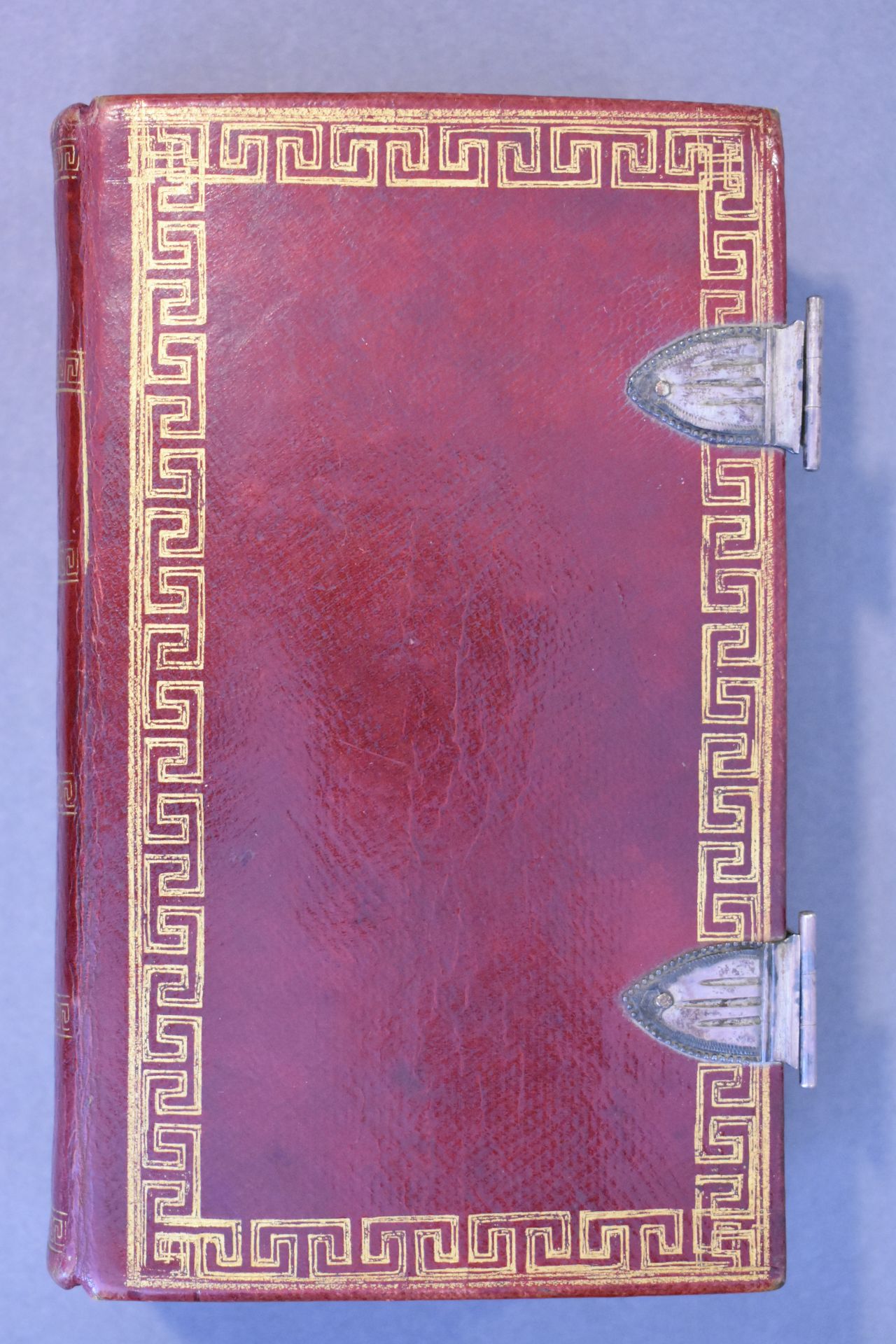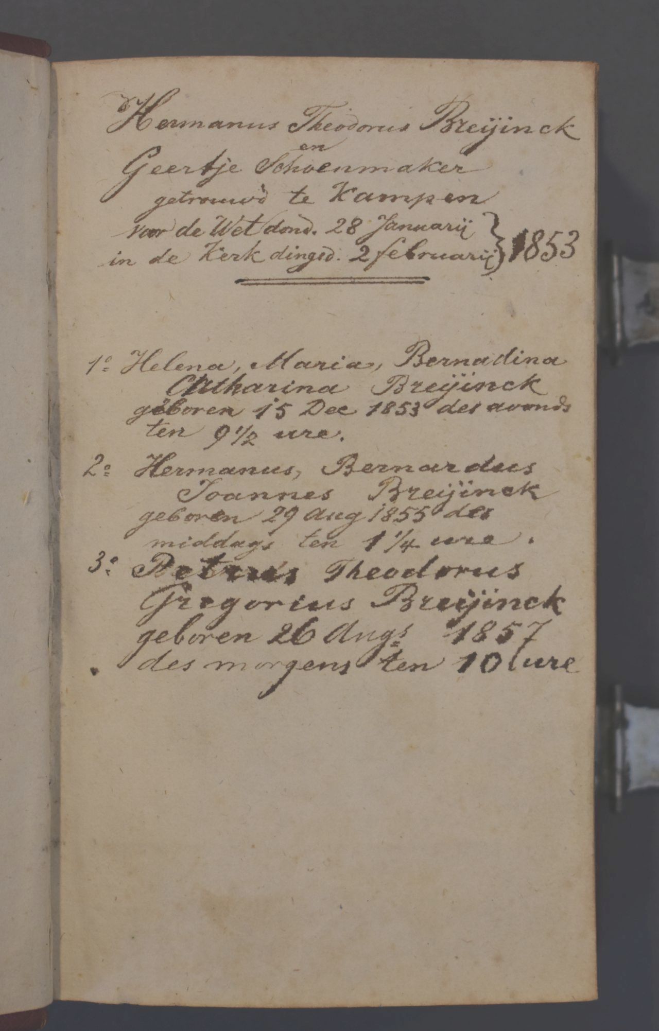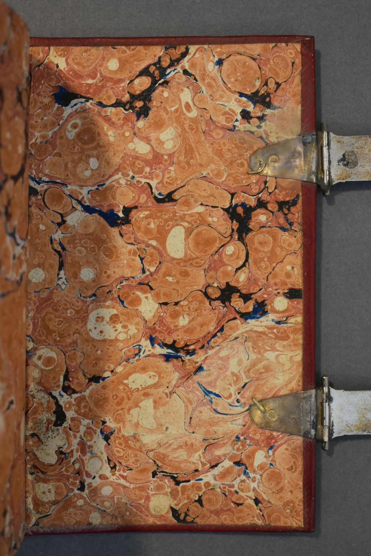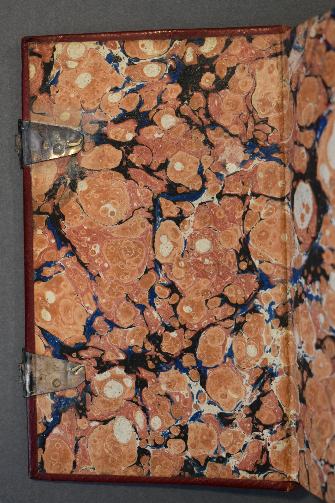 Boekband in rood leer met zilverbeslag en klamparmen in zuilvorm. Met 19de eeuwse familieaantekeningen.