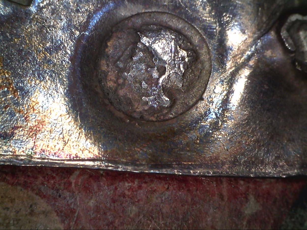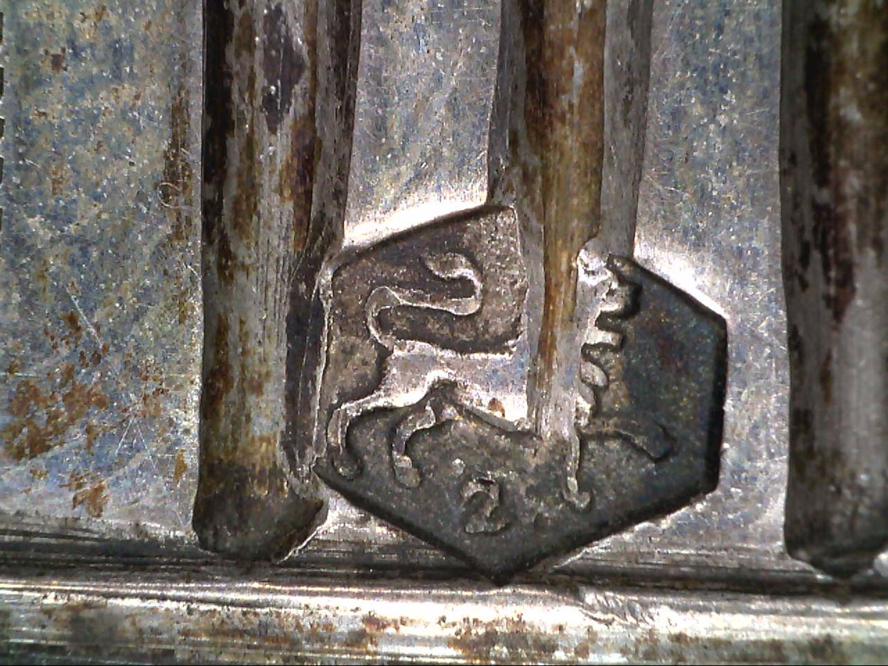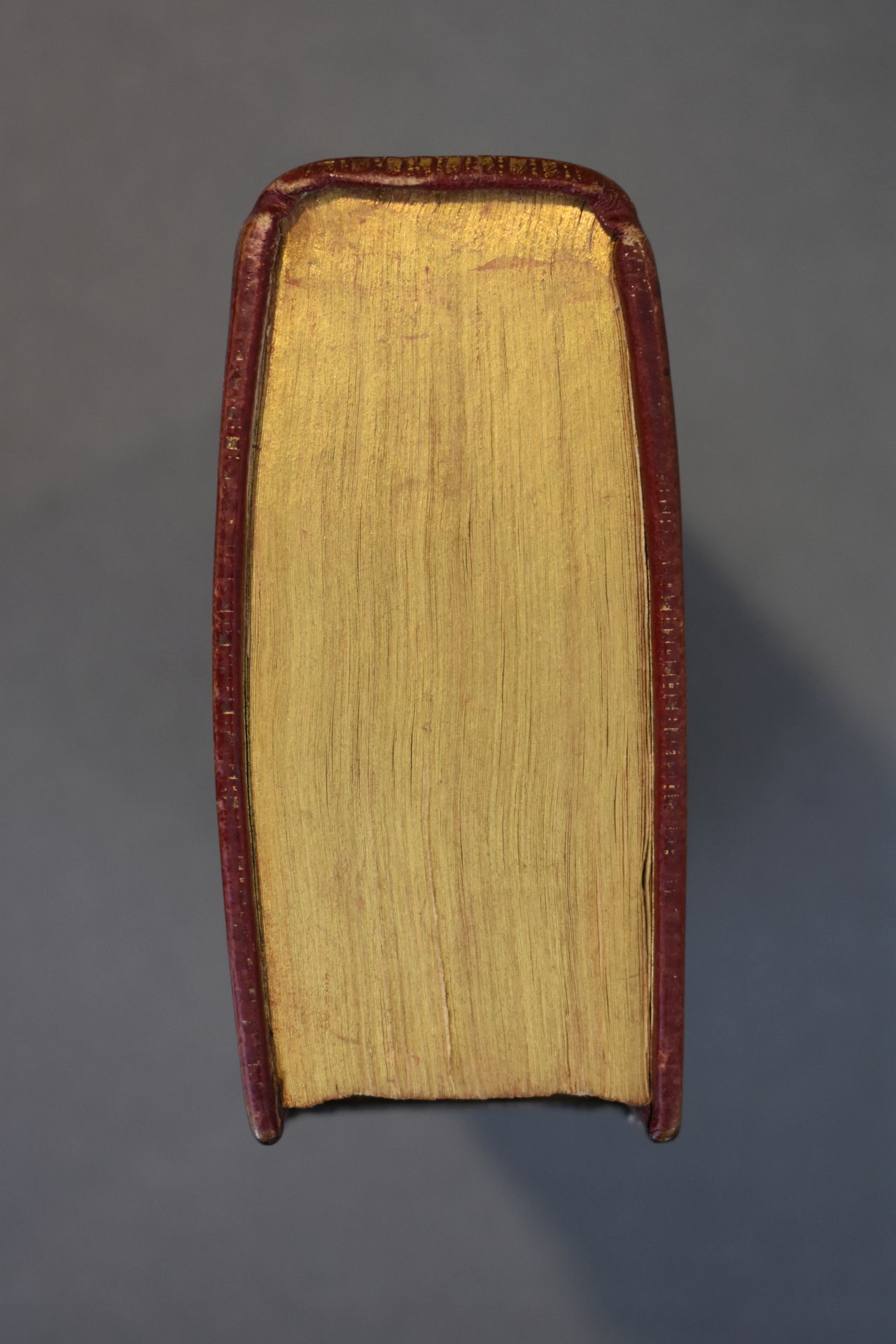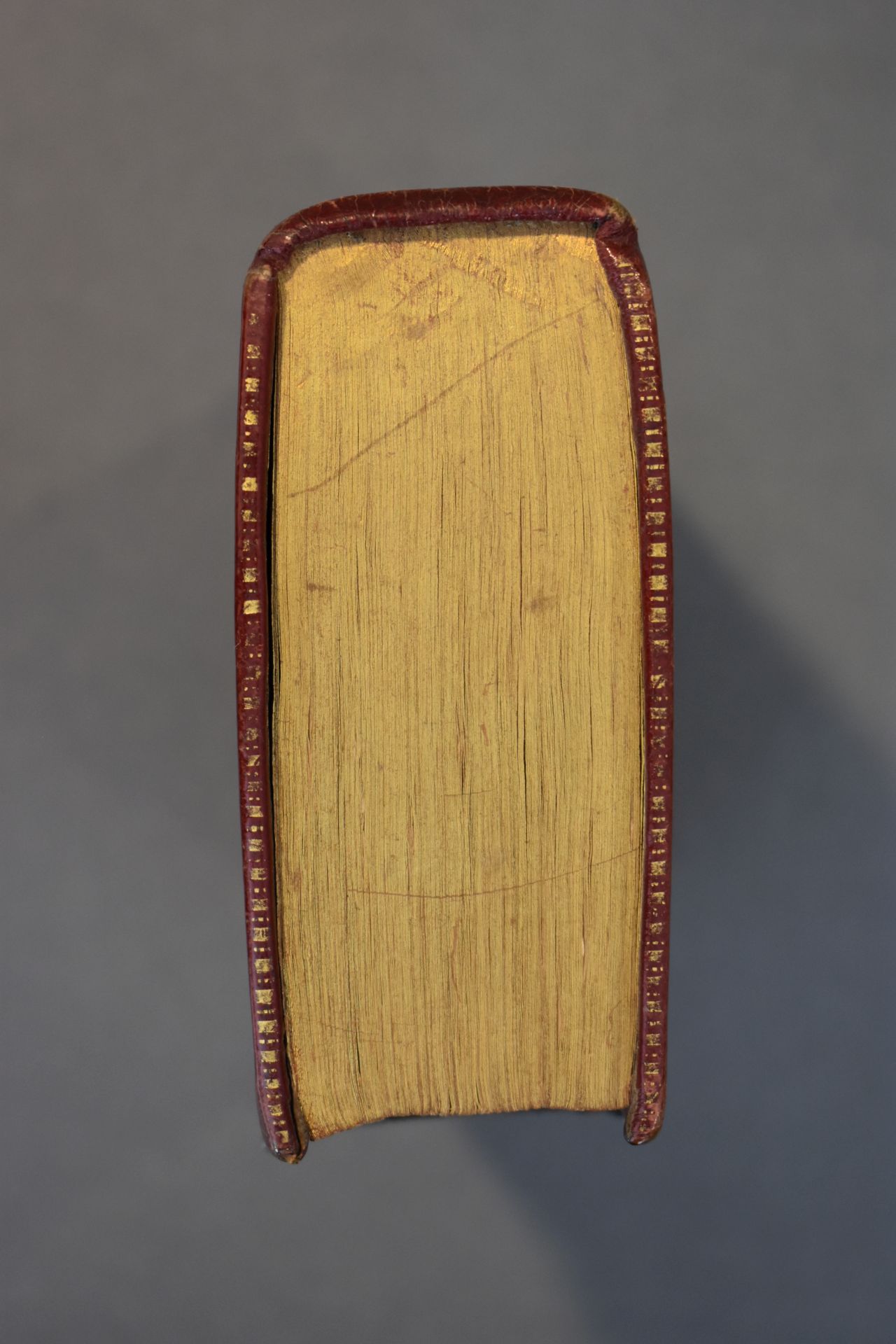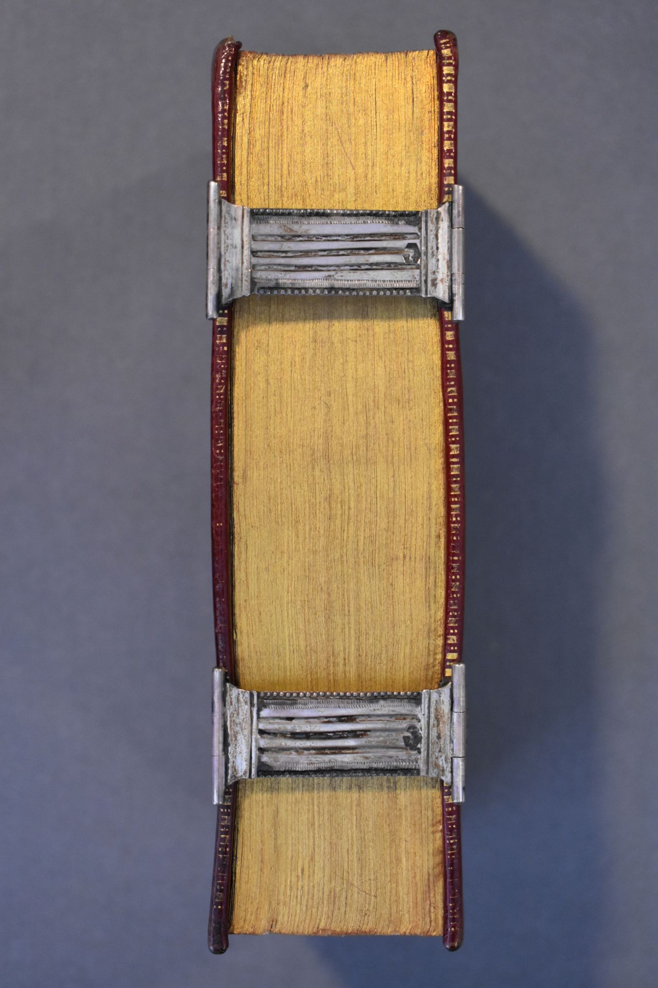 Boekband in rood leer met zilverbeslag en klamparmen in zuilvorm. Met 19de eeuwse familieaantekeningen.