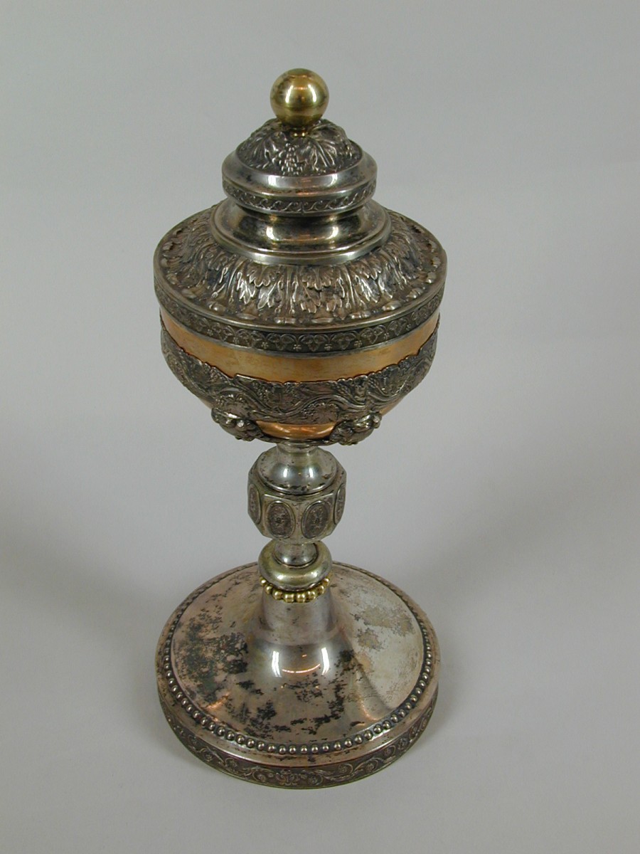 Ciborie, vergulde cuppa gehouden in uitgezaagde band met druivenranken, deksel met vergulde knop