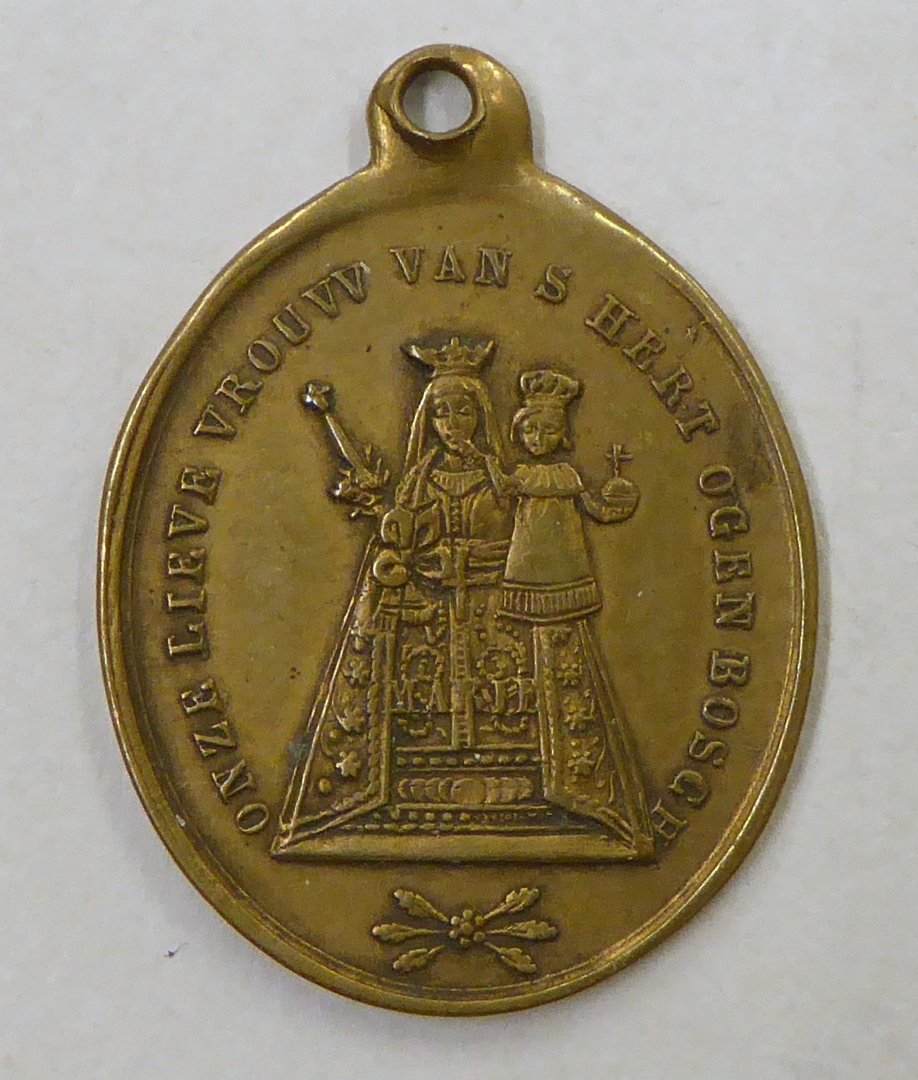 Draagpenning, ovaal, met beeld Onze Lieve Vrouw 's-Hertogenbosch, kz. "... bewaard en hersteld ..."
