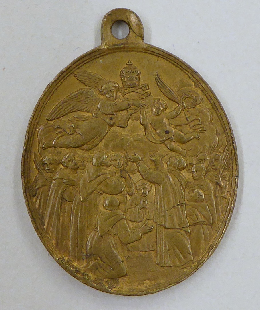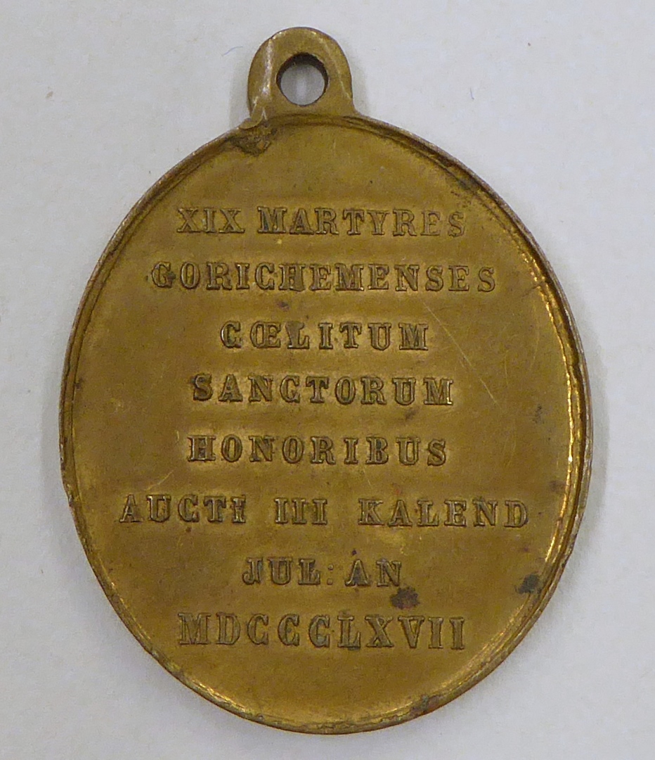 Draagpenning, ovaal, met negentien martelaren van Gorcum, kz. met "XIX martyres Gorichemensis ..."