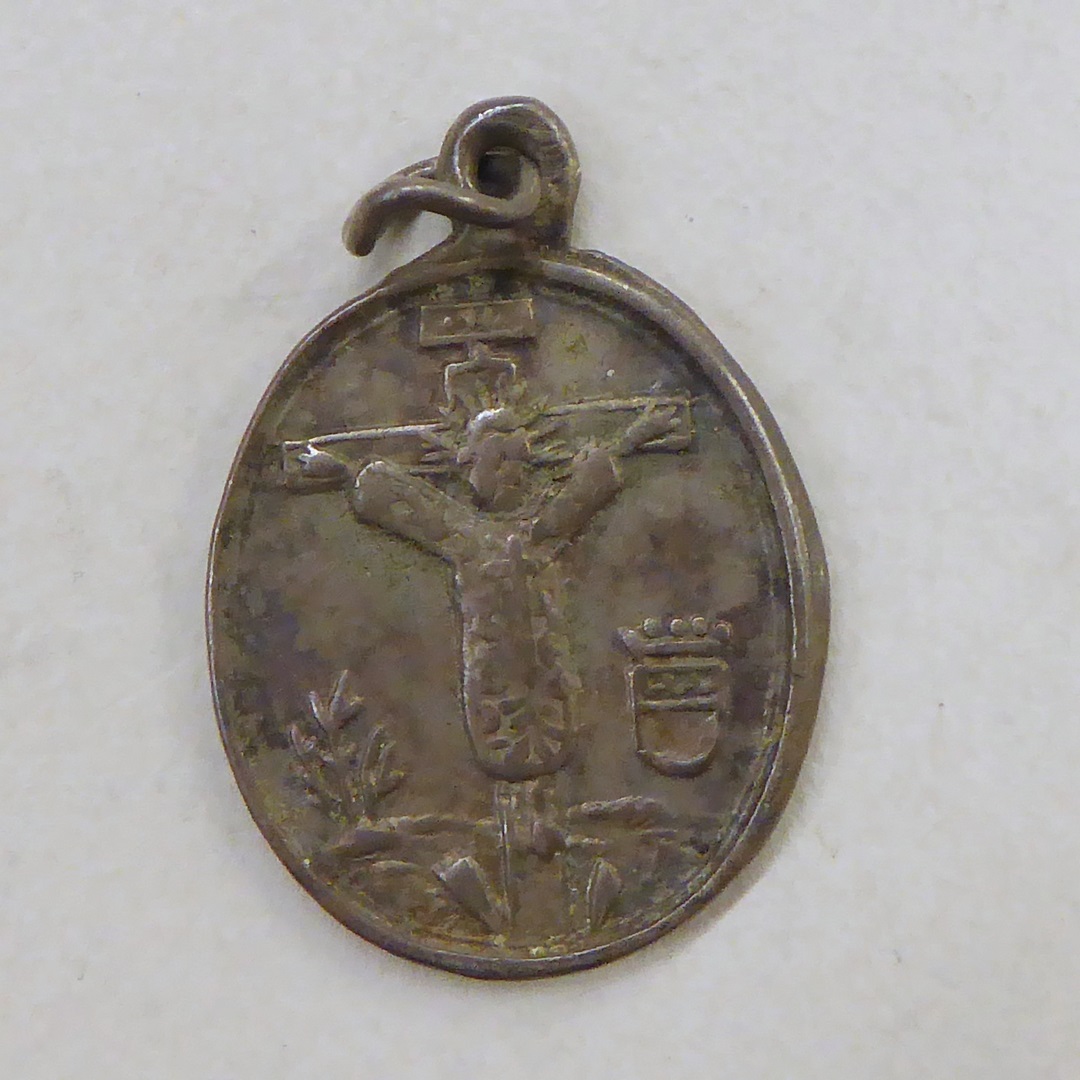 Draagpenning, ovaal, H. Brigitta voorzien van rozenkrans, kz. kruisbeeld