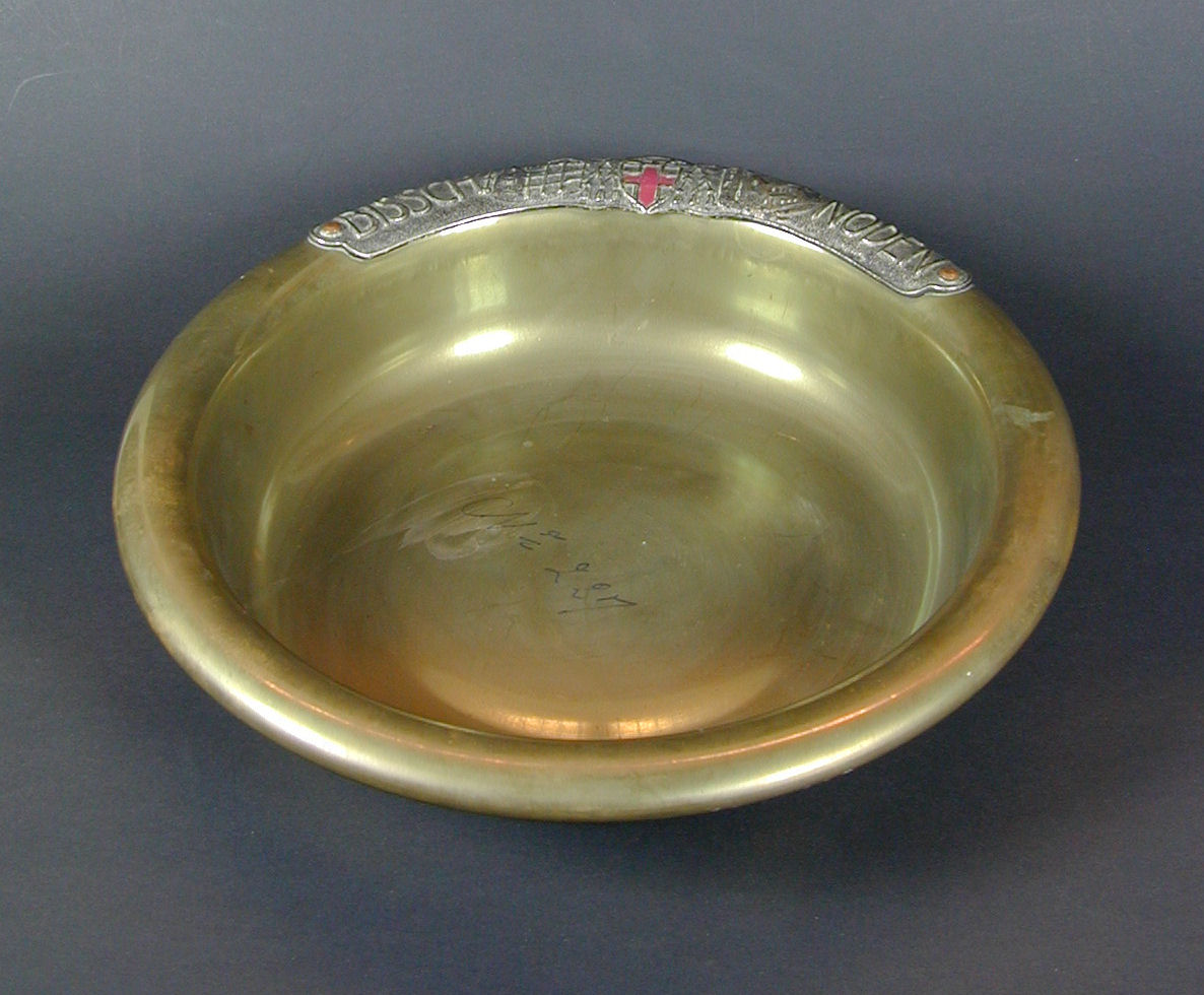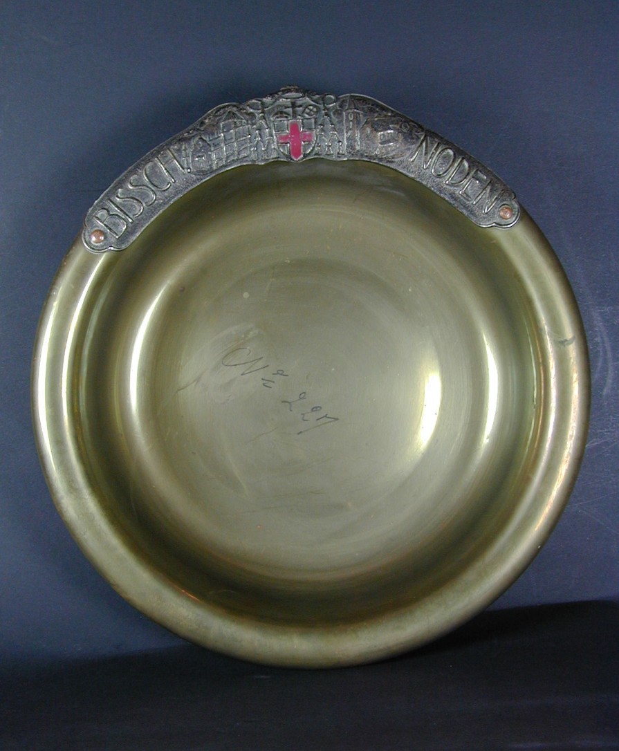 Collecteschaal met zilverkleurige plaquette met wapen van het bisdom Haarlem, kerk in aanbouw links en voltooide kerk rechts, met "Bissch(oppelijke) Noden"