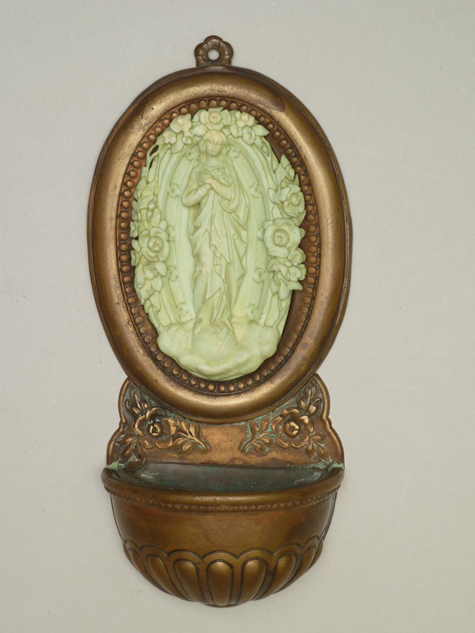 Wijwaterbakje met ovale achterzijde met kunststof medaillon met Maria op een aardbol