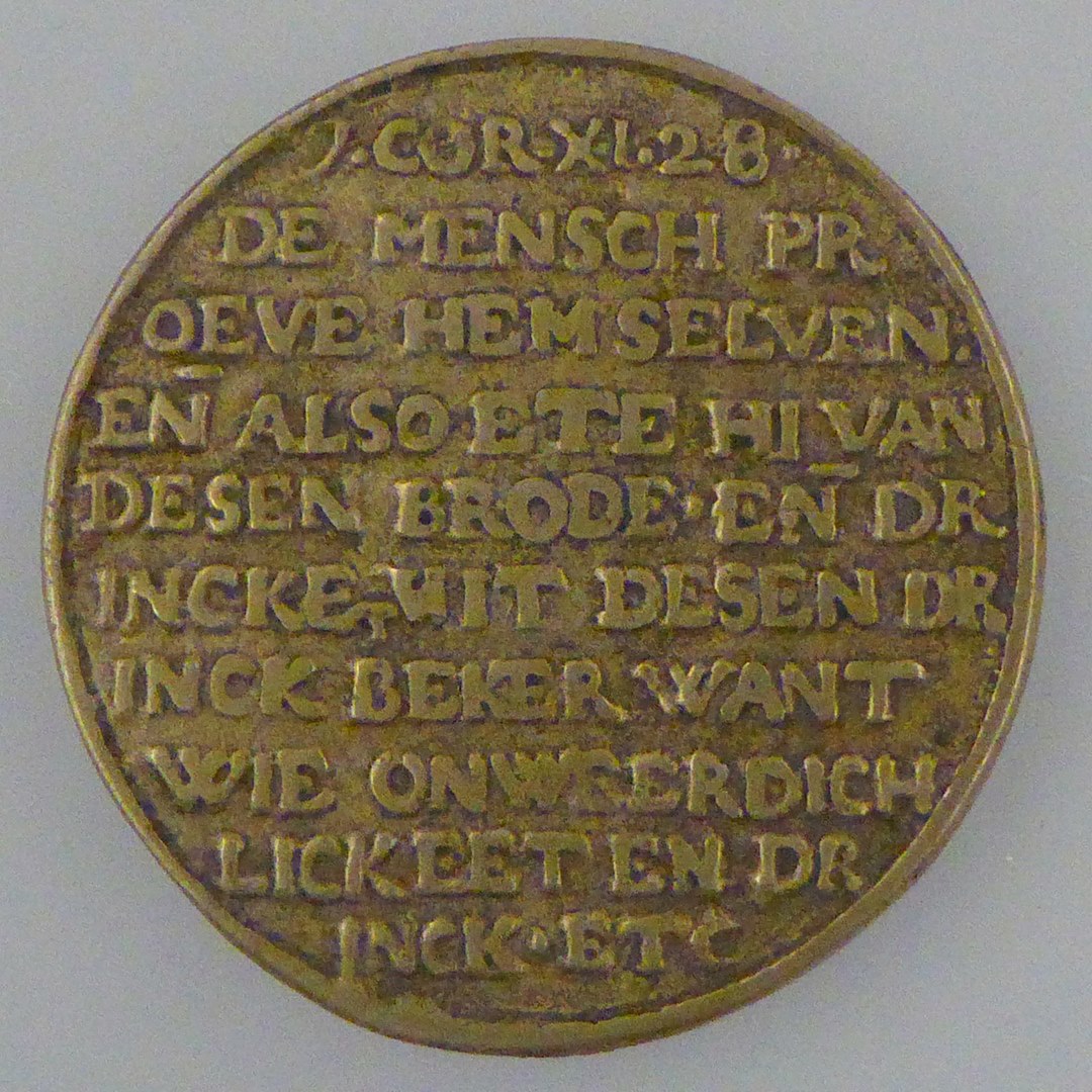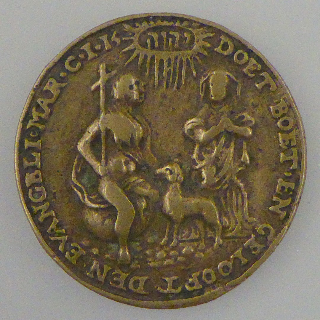 Penning met Johannes de Doper, lam Gods, biddende vrouw, "Doet boet...", kz. tekst (1 Kor.11:28)