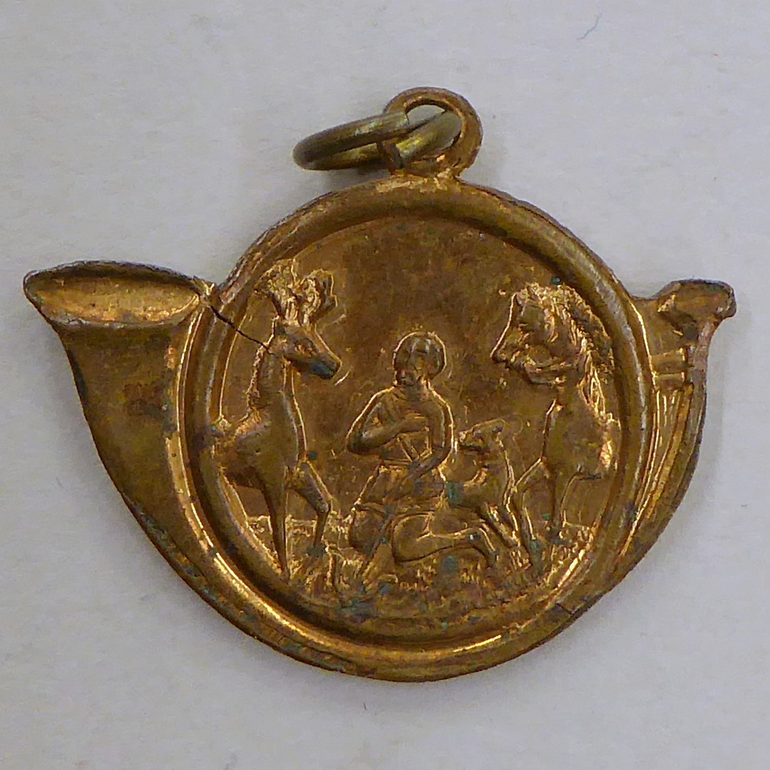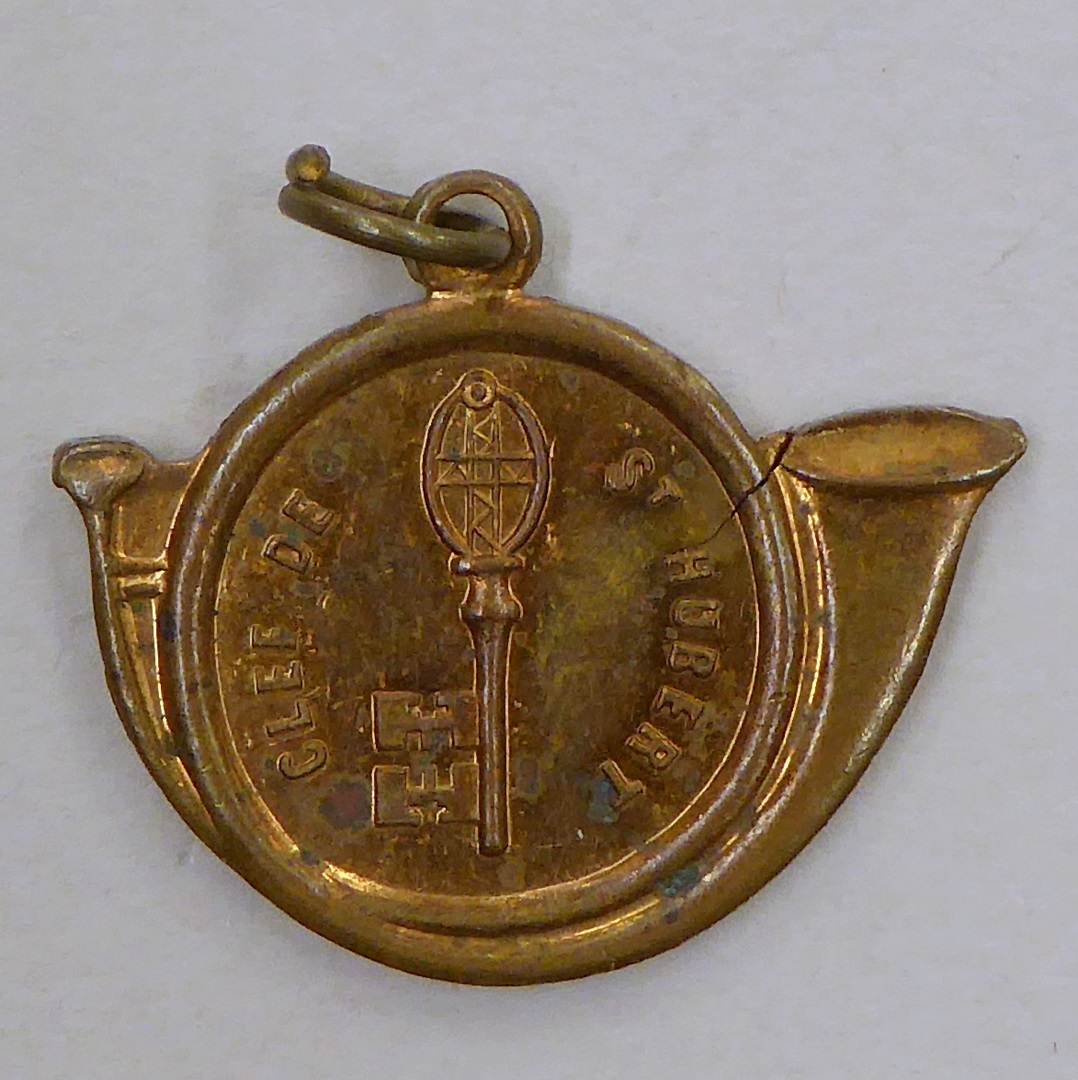 Verenigingsmedaille, sleutel van St. Hubert in vorm van hoorn, kz. met jachttafereel