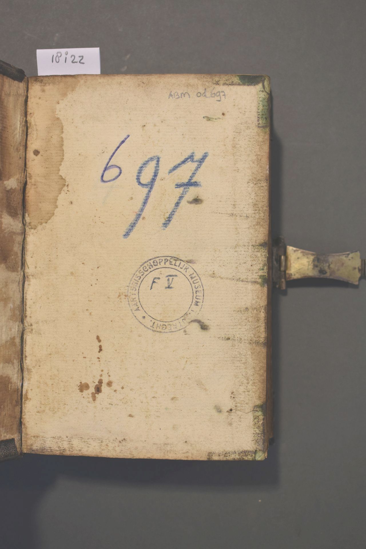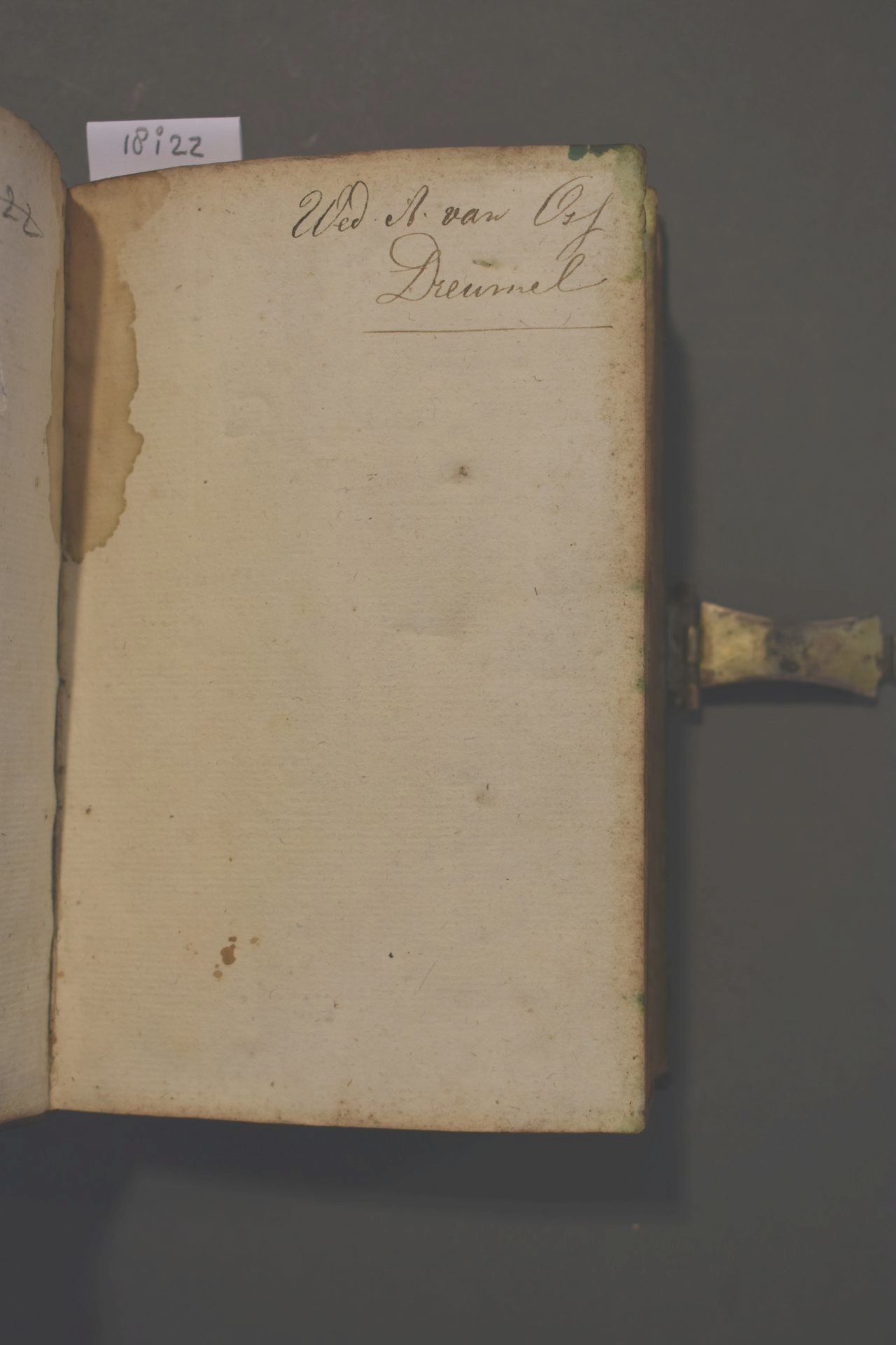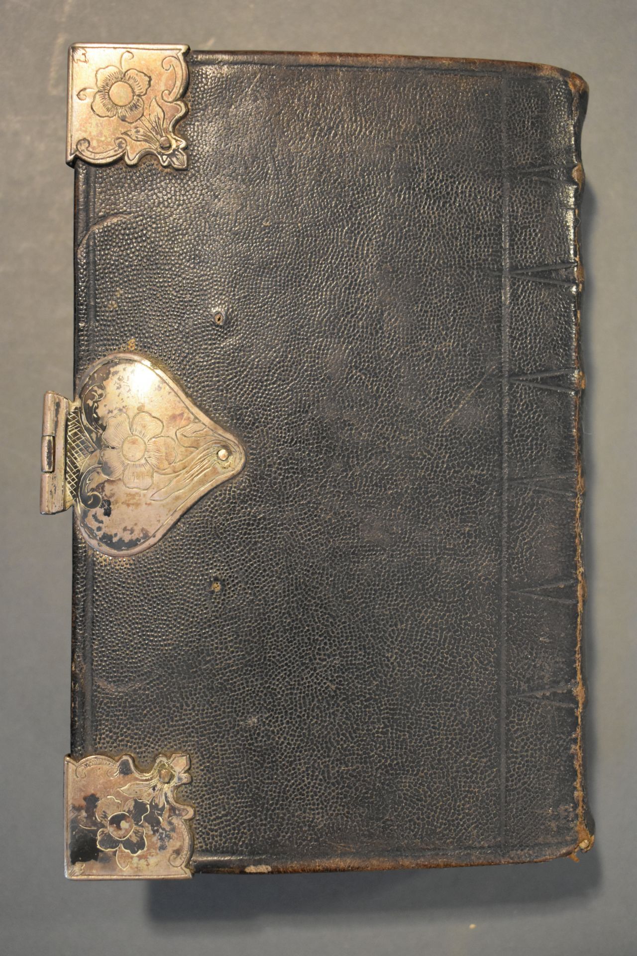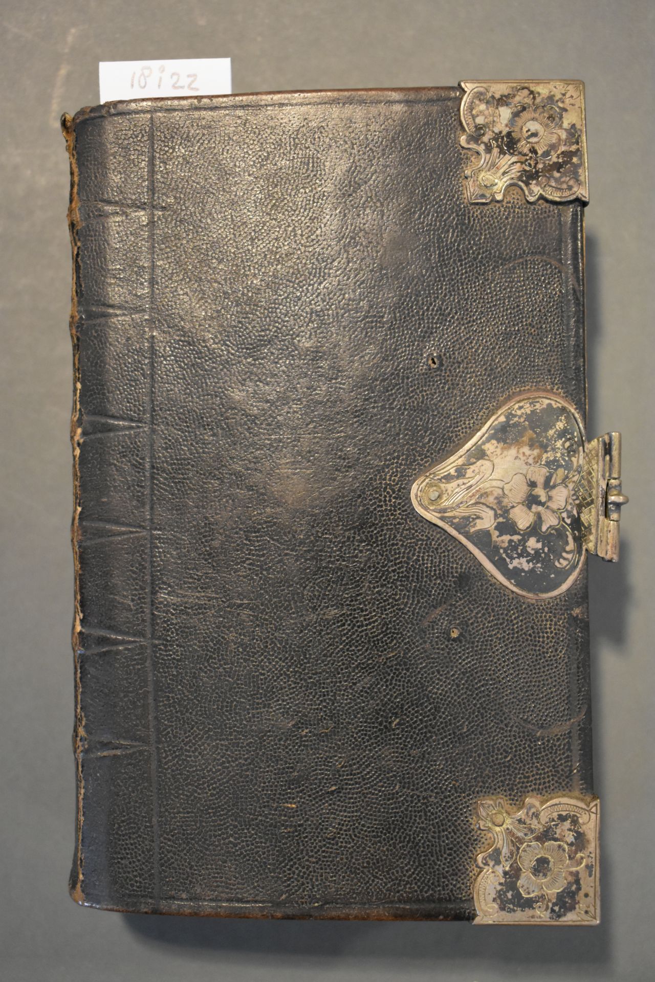 Christelyke onderwyzingen en gebeden, wegens de voornaamste pligten der geloovige; en bemerkingen op de vier uiterste van den mensch [...]. Band met zilveren beslag bestaande uit een slot en vier hoekstukken. In de klamparm staan de initialen 'HPK' gekrast.