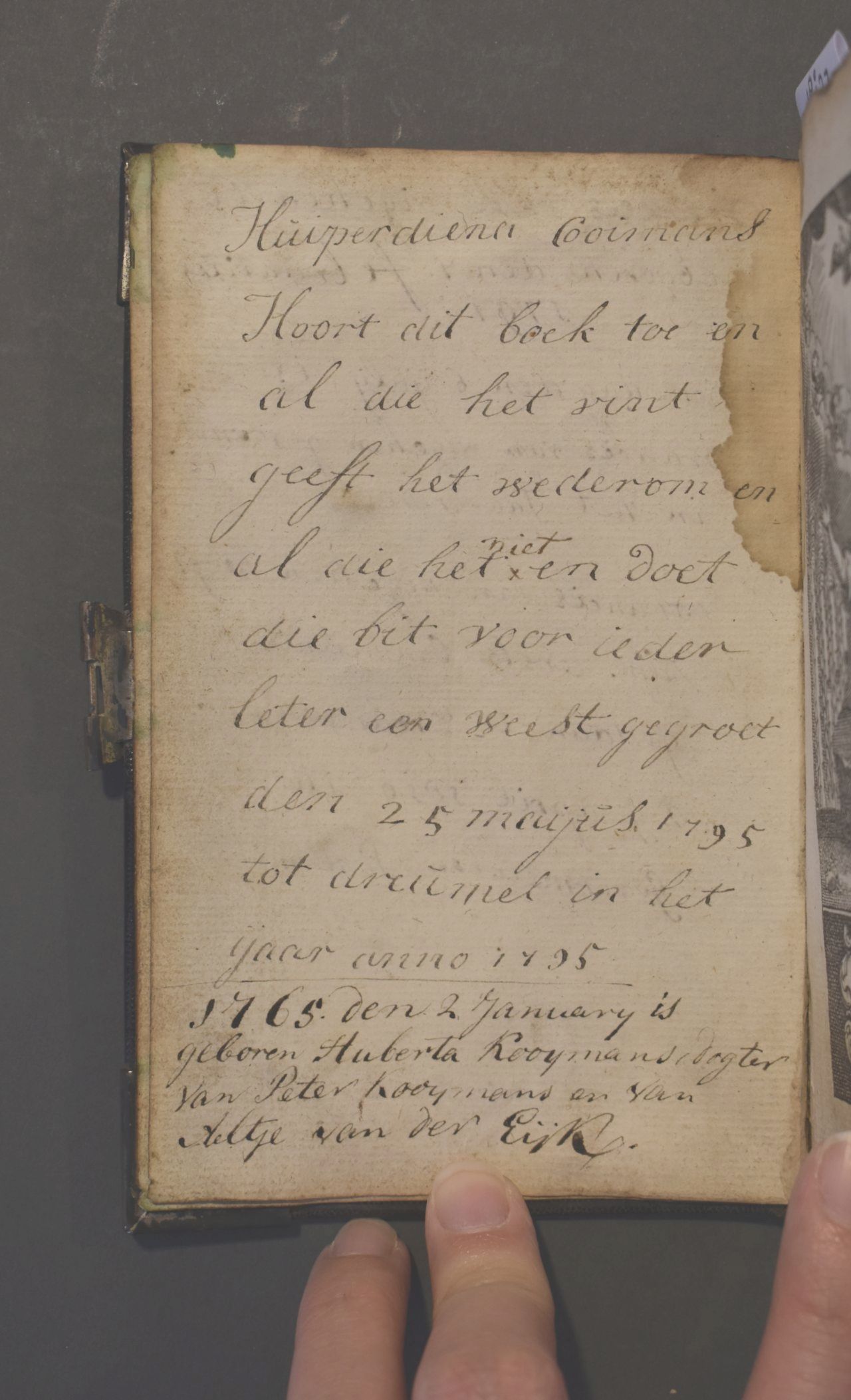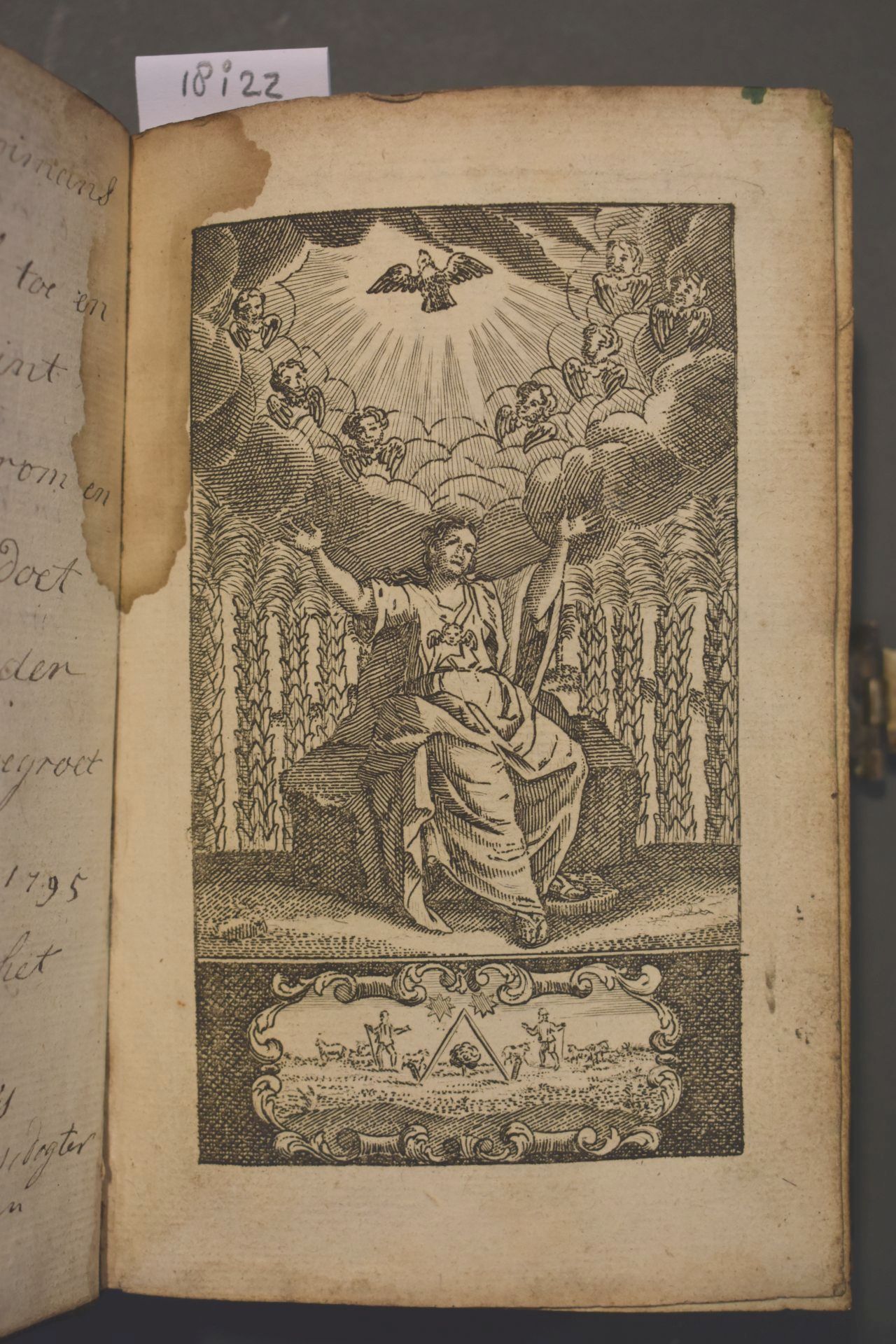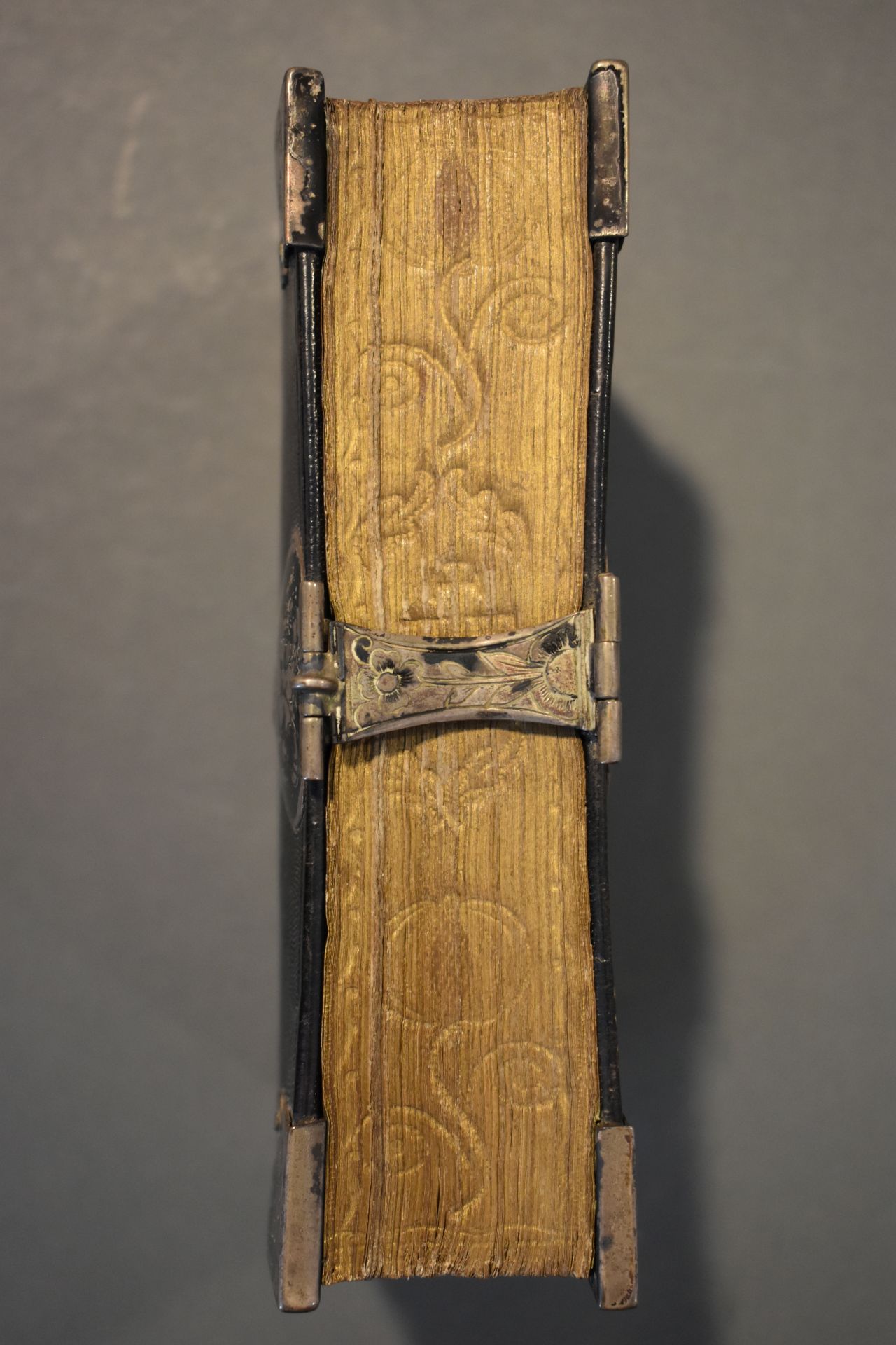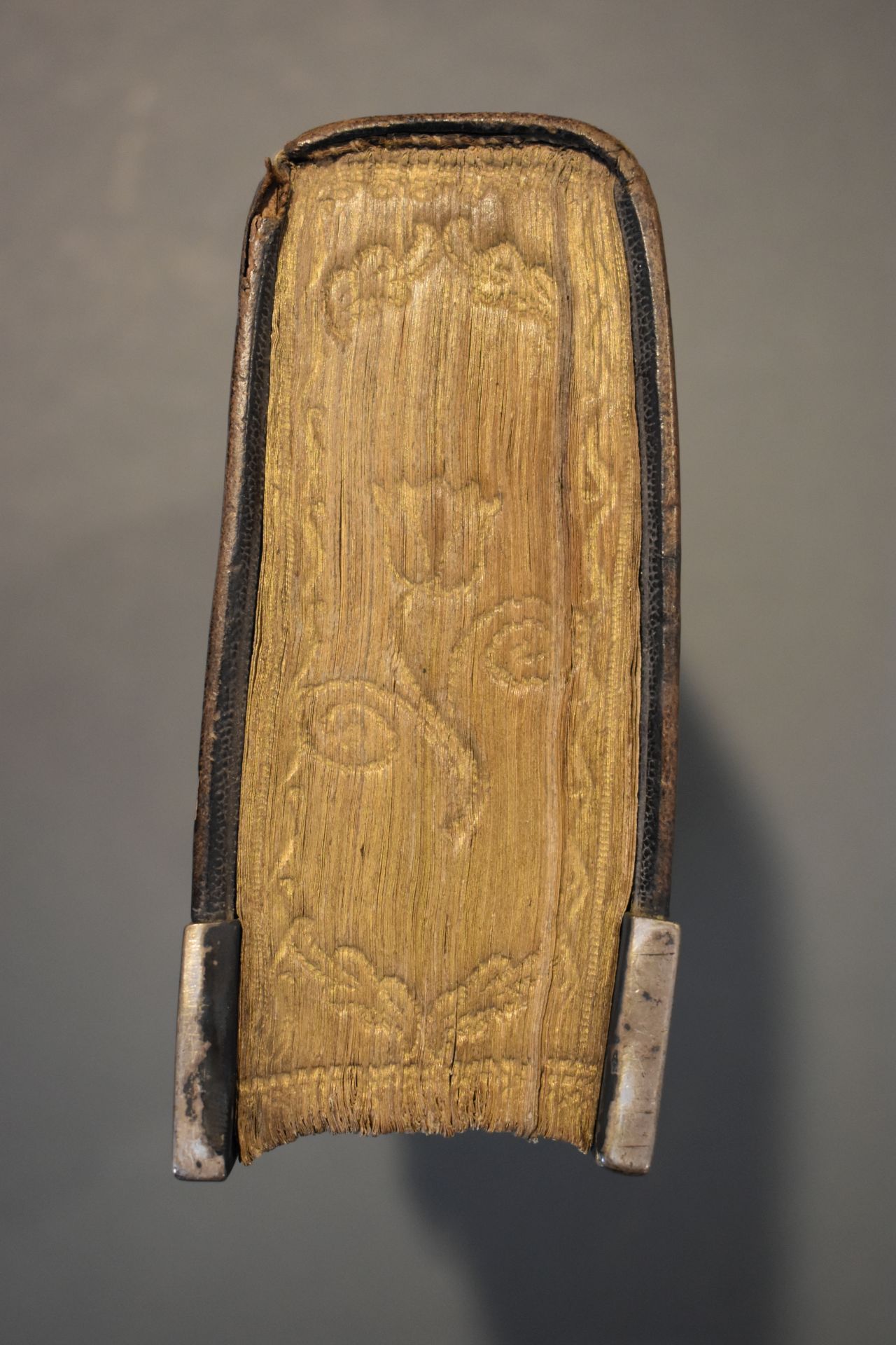Christelyke onderwyzingen en gebeden, wegens de voornaamste pligten der geloovige; en bemerkingen op de vier uiterste van den mensch [...]. Band met zilveren beslag bestaande uit een slot en vier hoekstukken. In de klamparm staan de initialen 'HPK' gekrast.