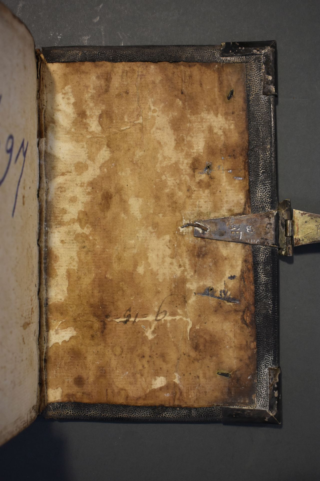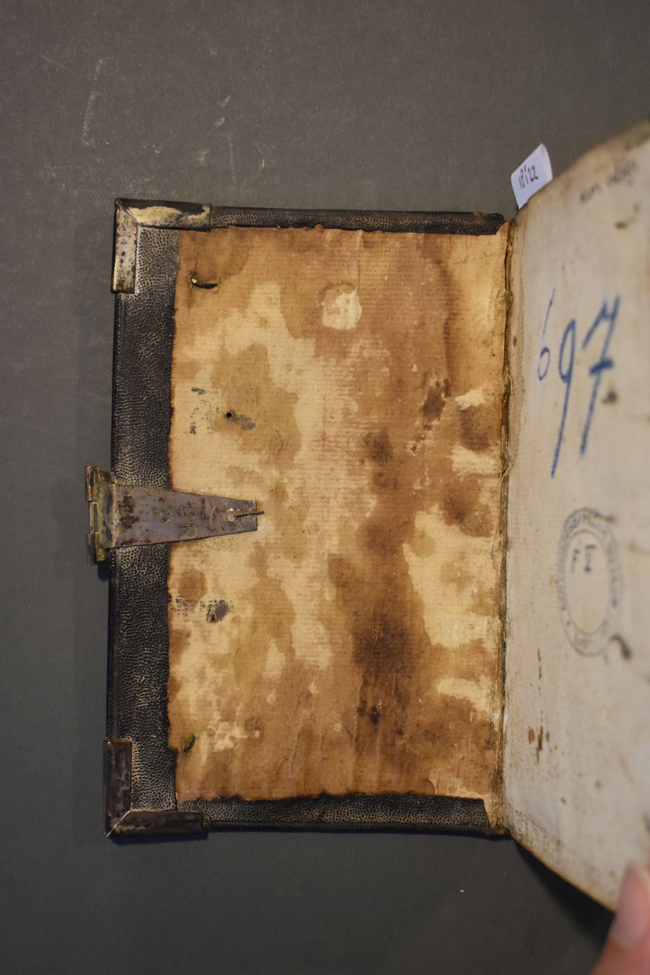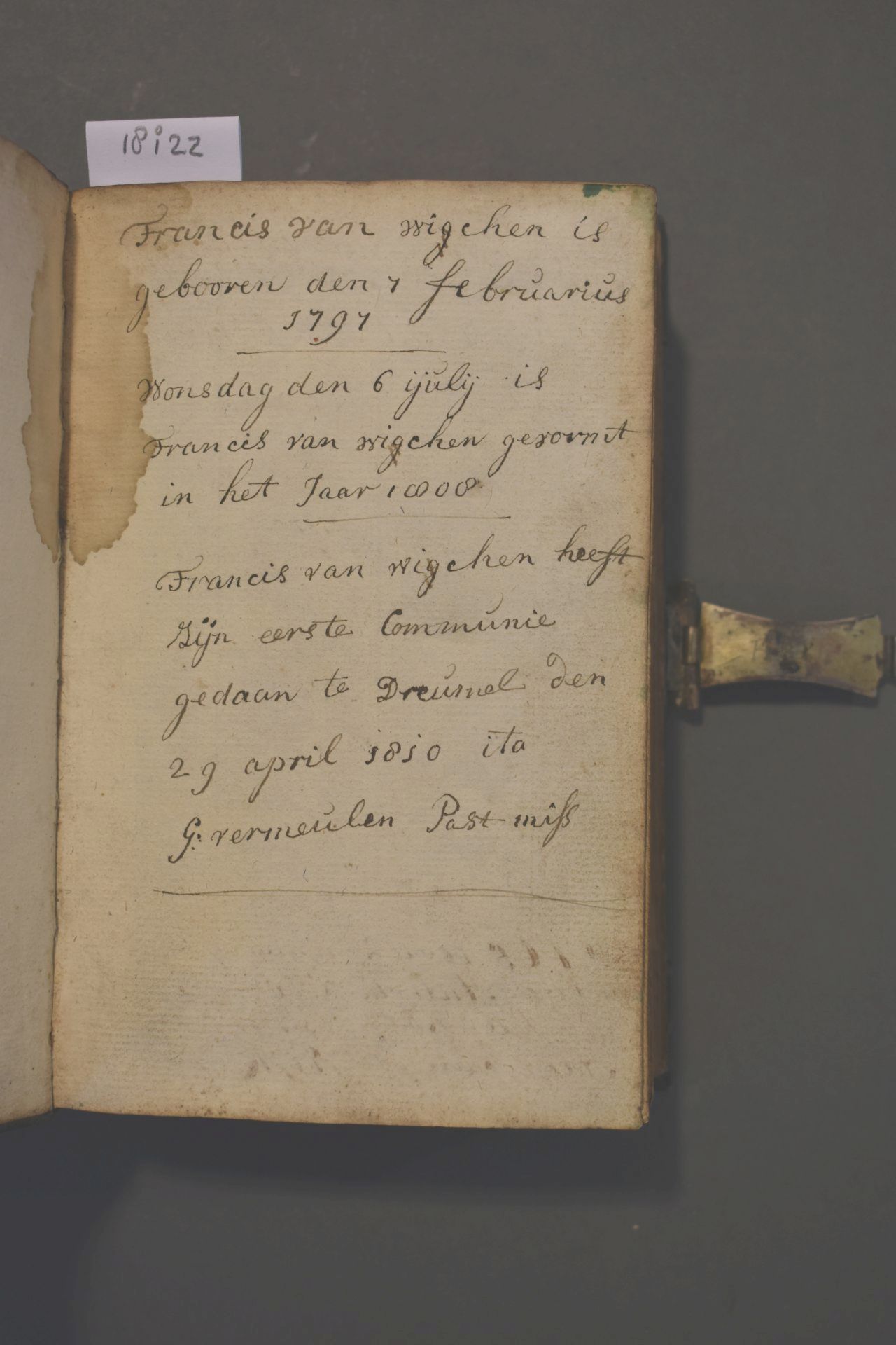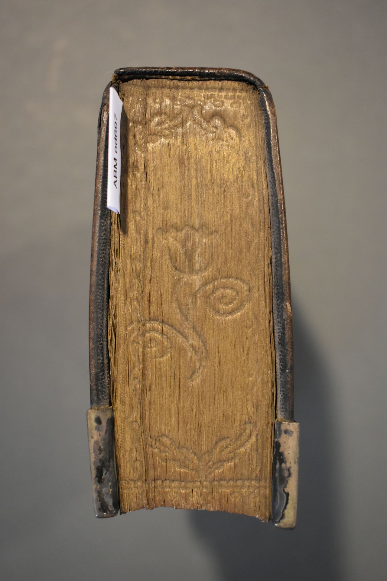 Christelyke onderwyzingen en gebeden, wegens de voornaamste pligten der geloovige; en bemerkingen op de vier uiterste van den mensch [...]. Band met zilveren beslag bestaande uit een slot en vier hoekstukken. In de klamparm staan de initialen 'HPK' gekrast.