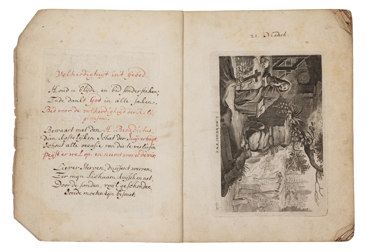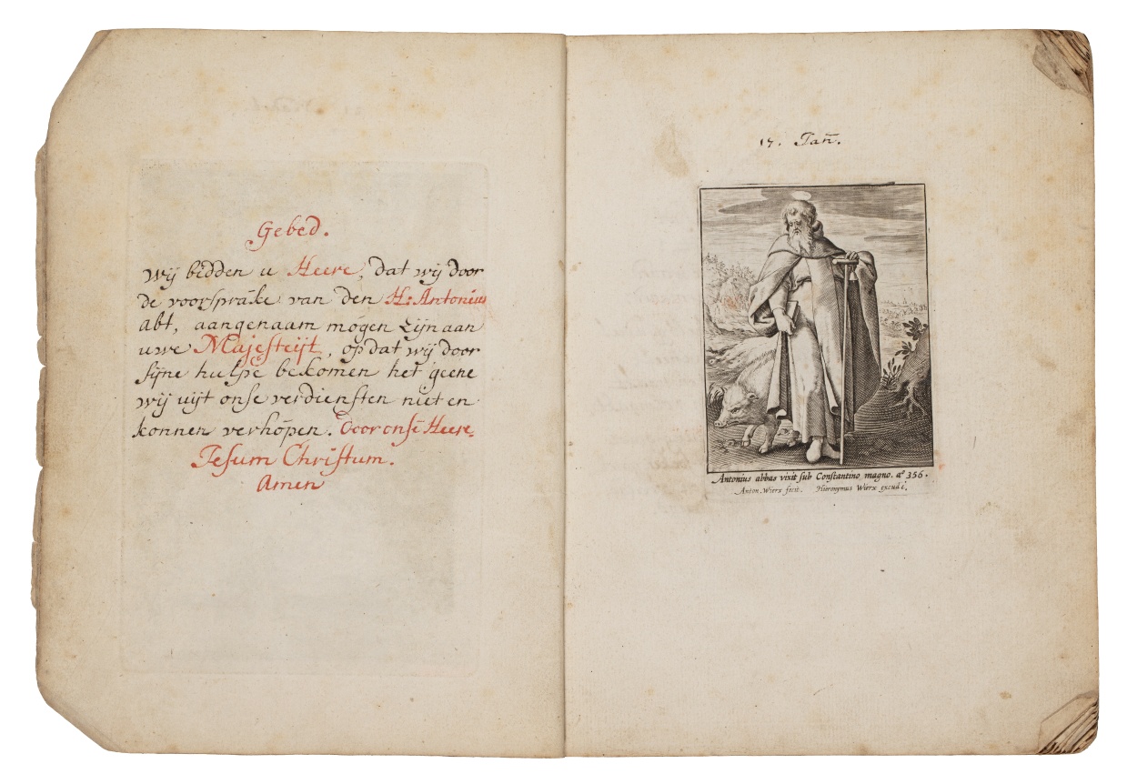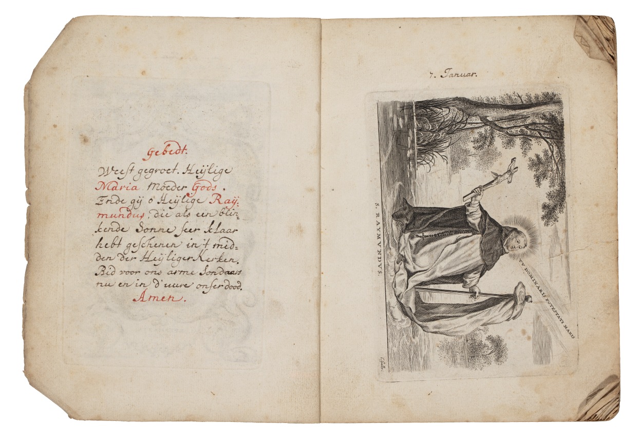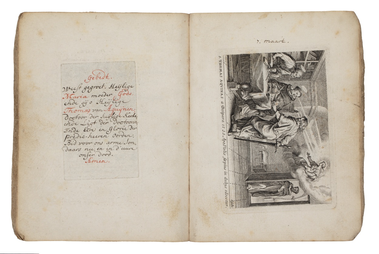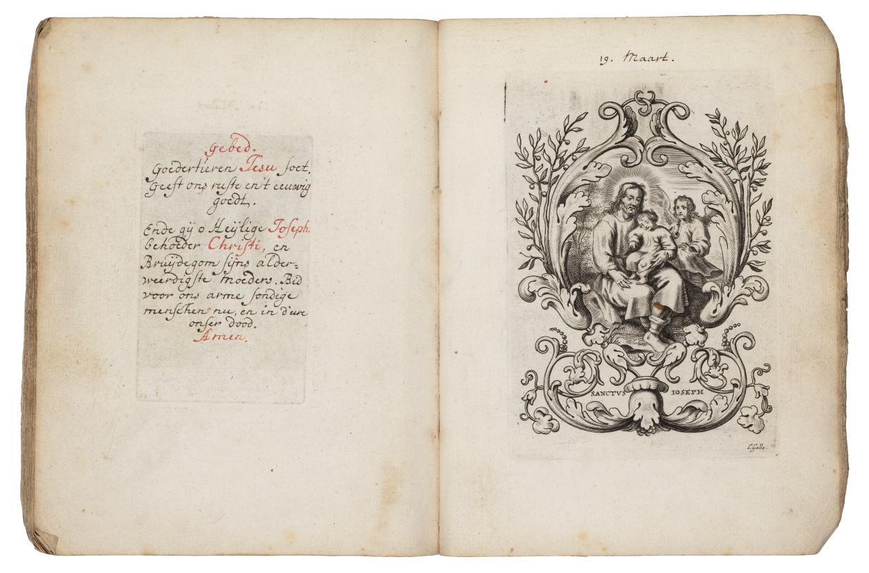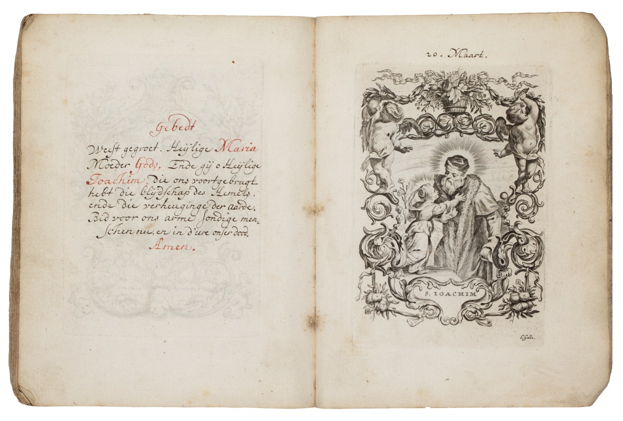 Album met handgeschreven gebeden en meditaties tot diverse heiligen (januari-oktober), met prenten