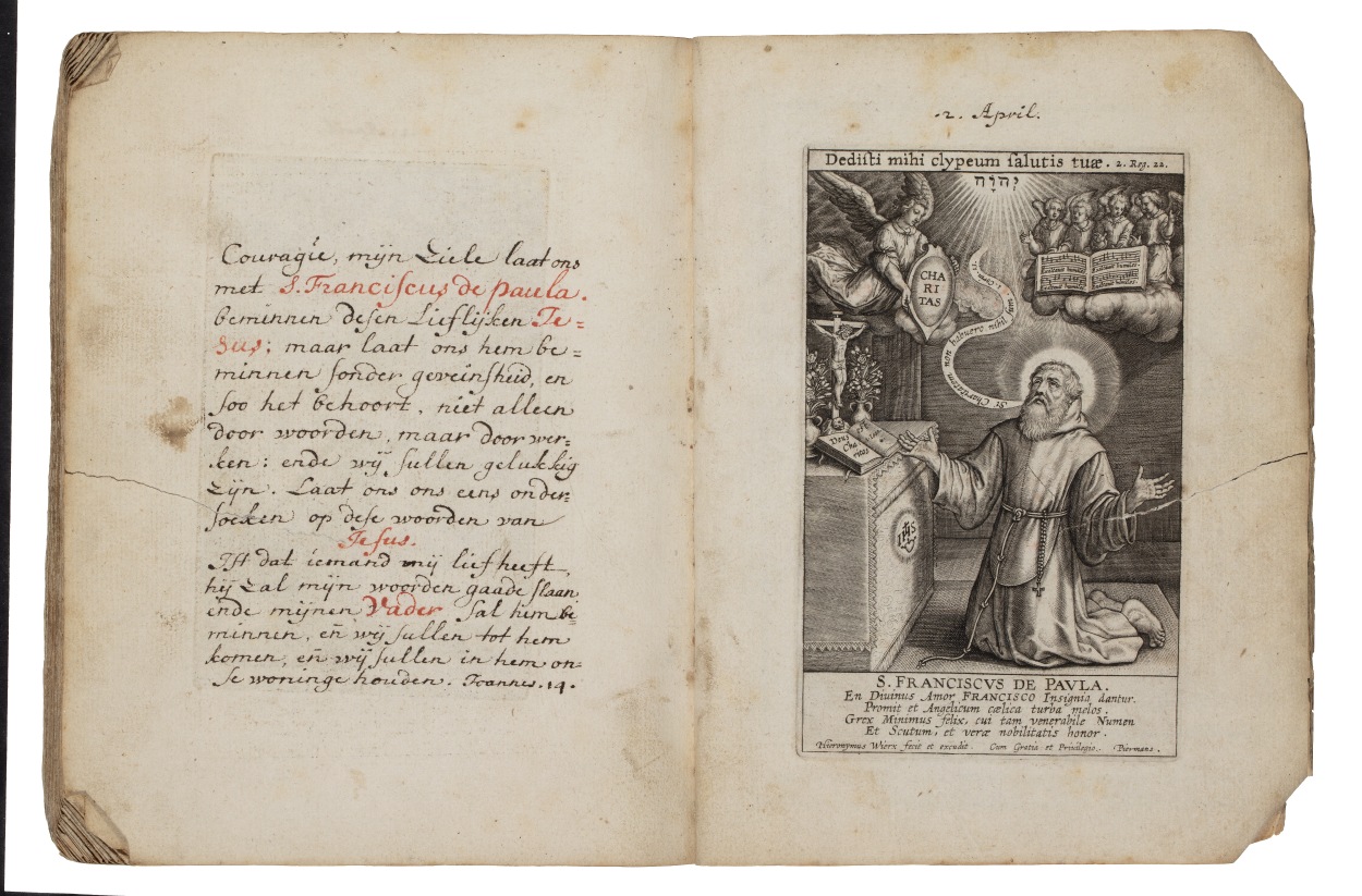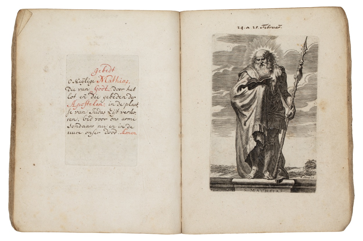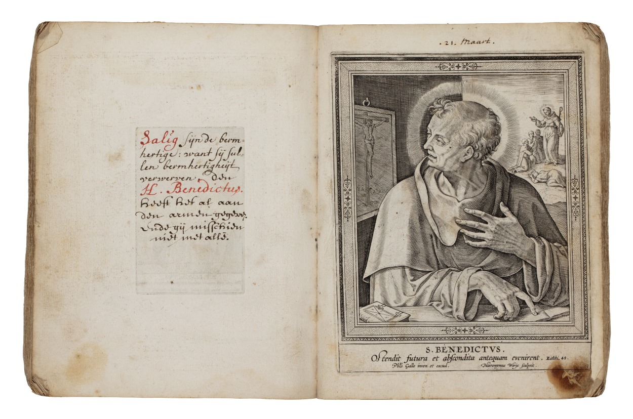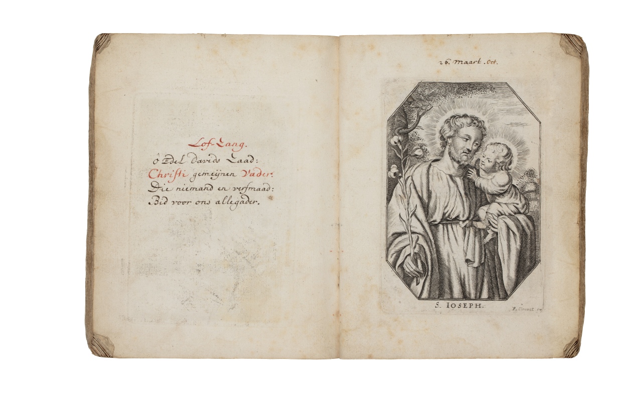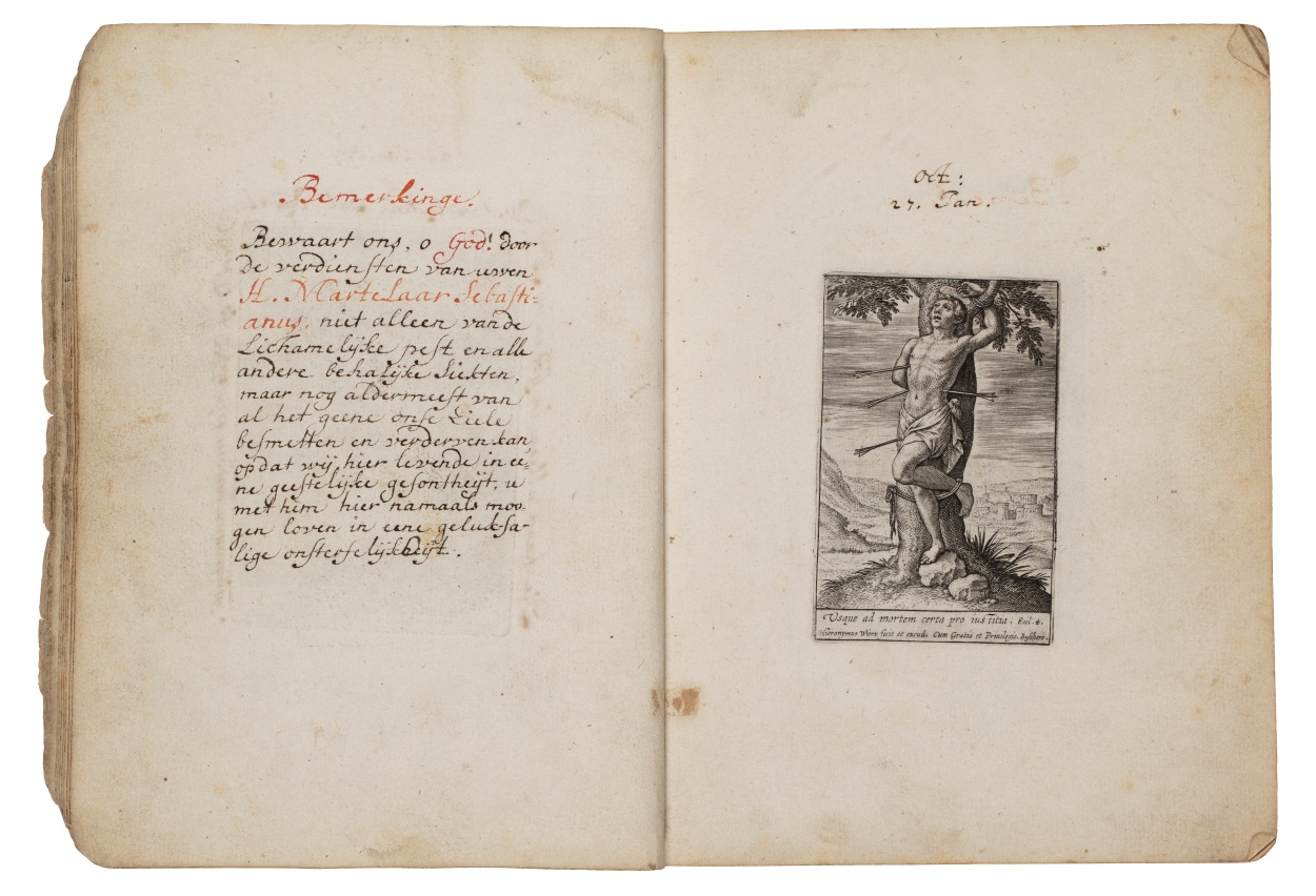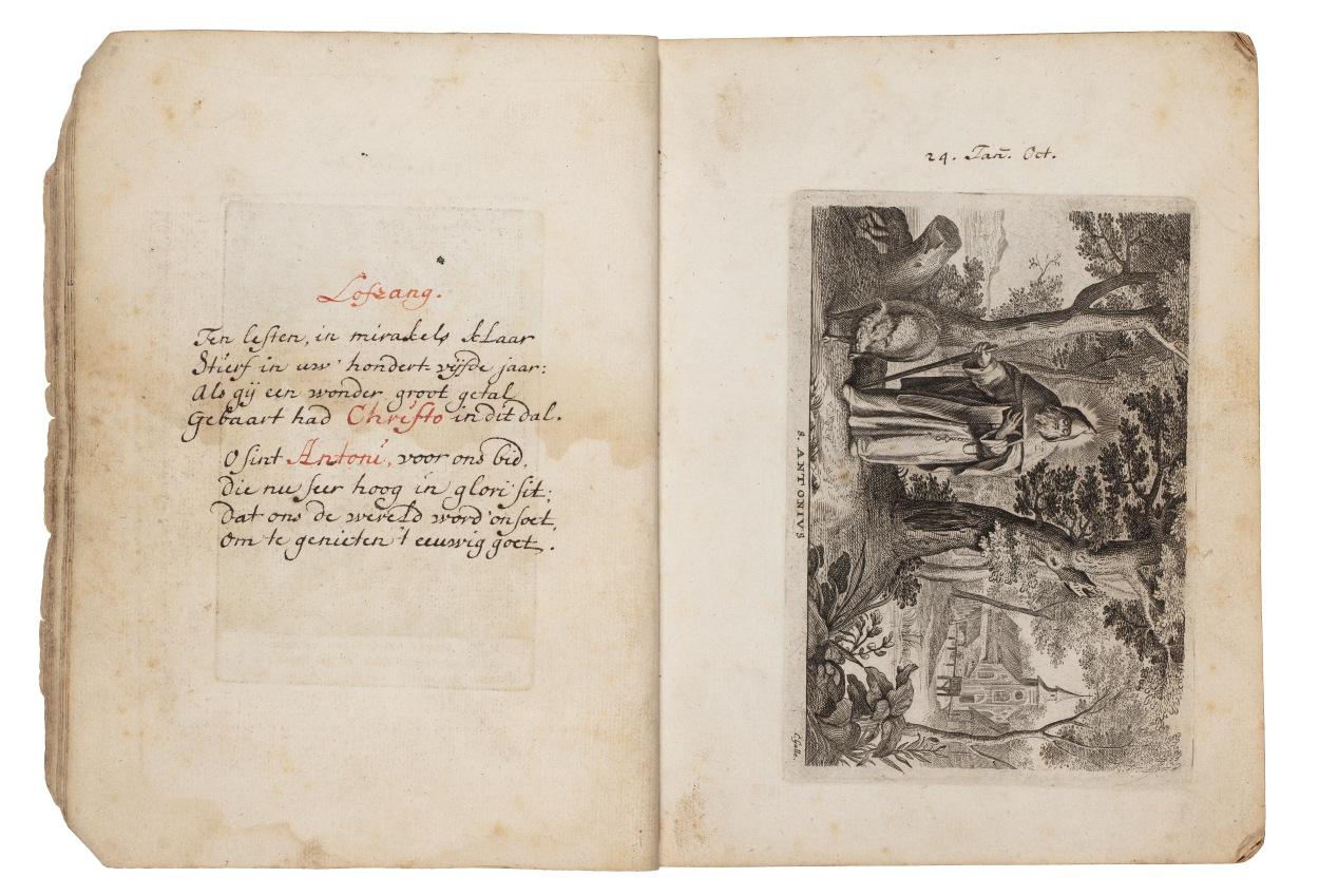Album met handgeschreven gebeden en meditaties tot diverse heiligen (januari-oktober), met prenten