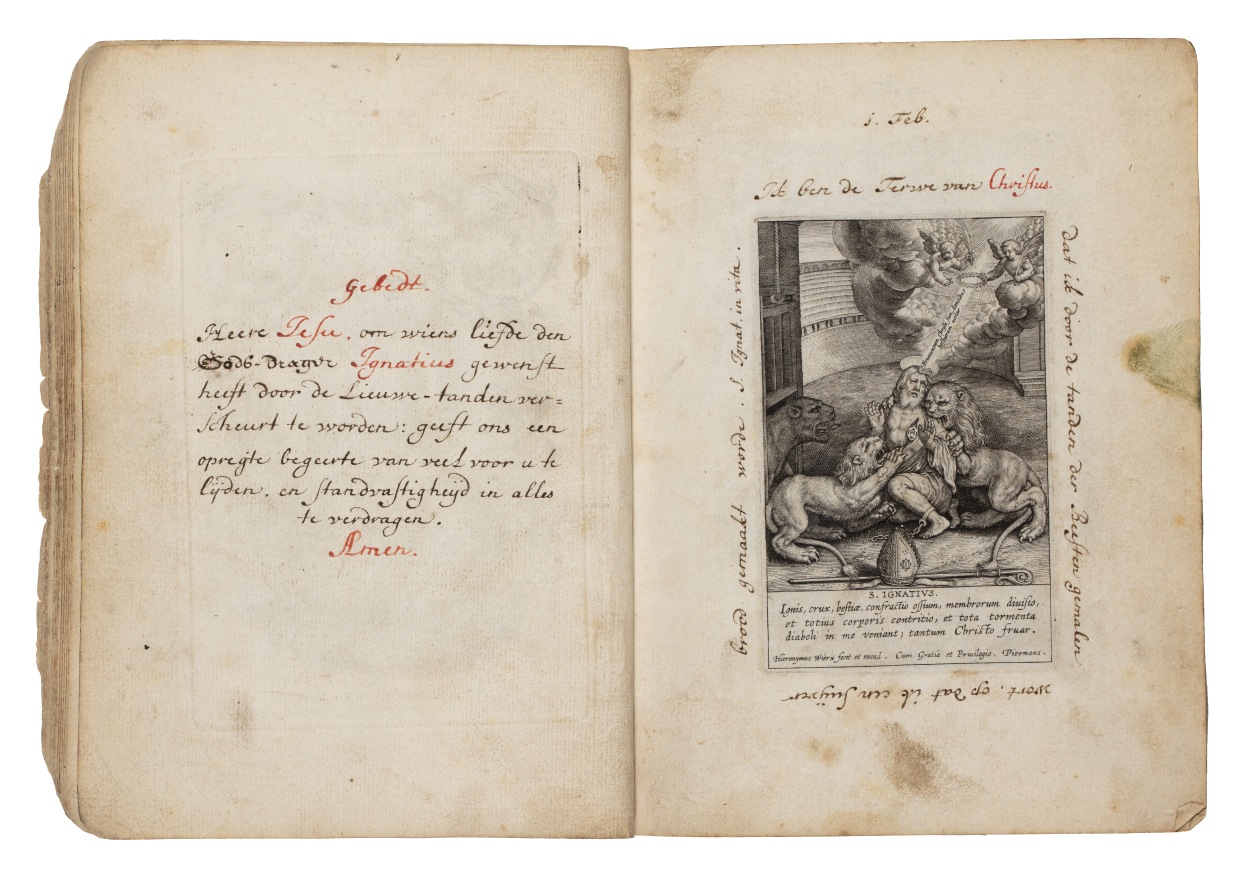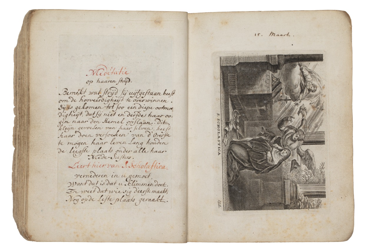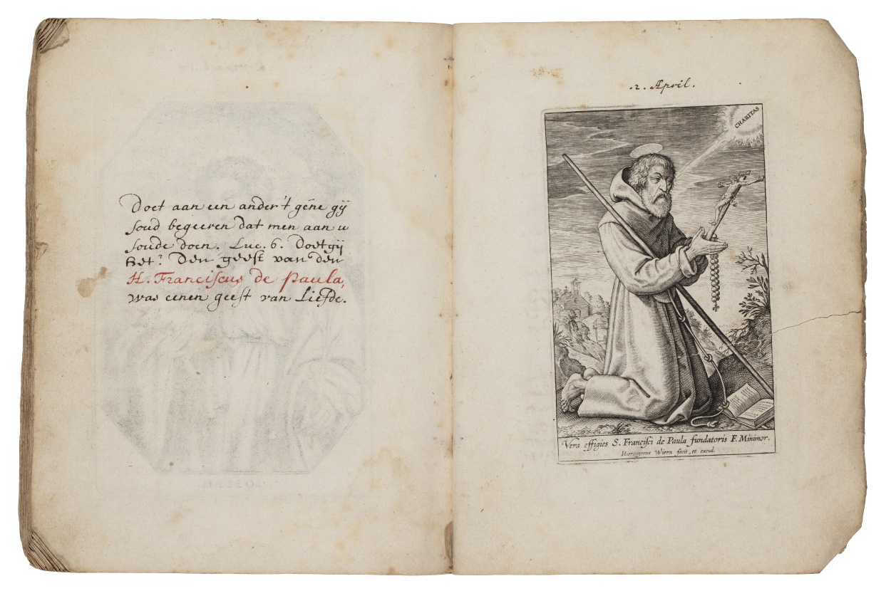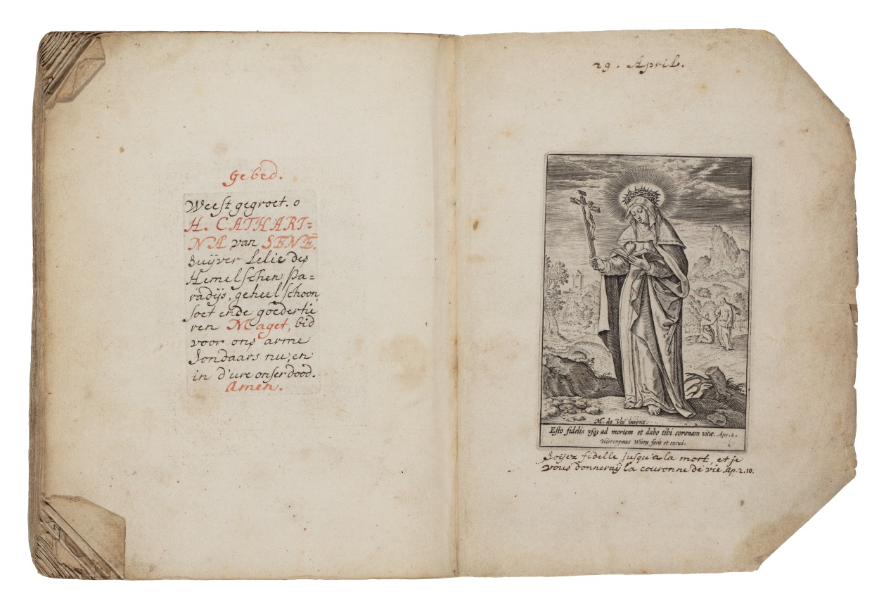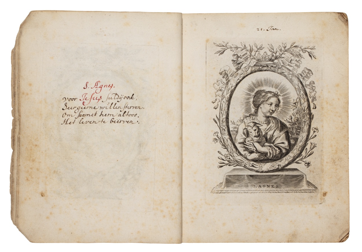 Album met handgeschreven gebeden en meditaties tot diverse heiligen (januari-oktober), met prenten