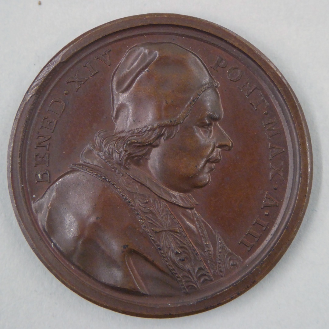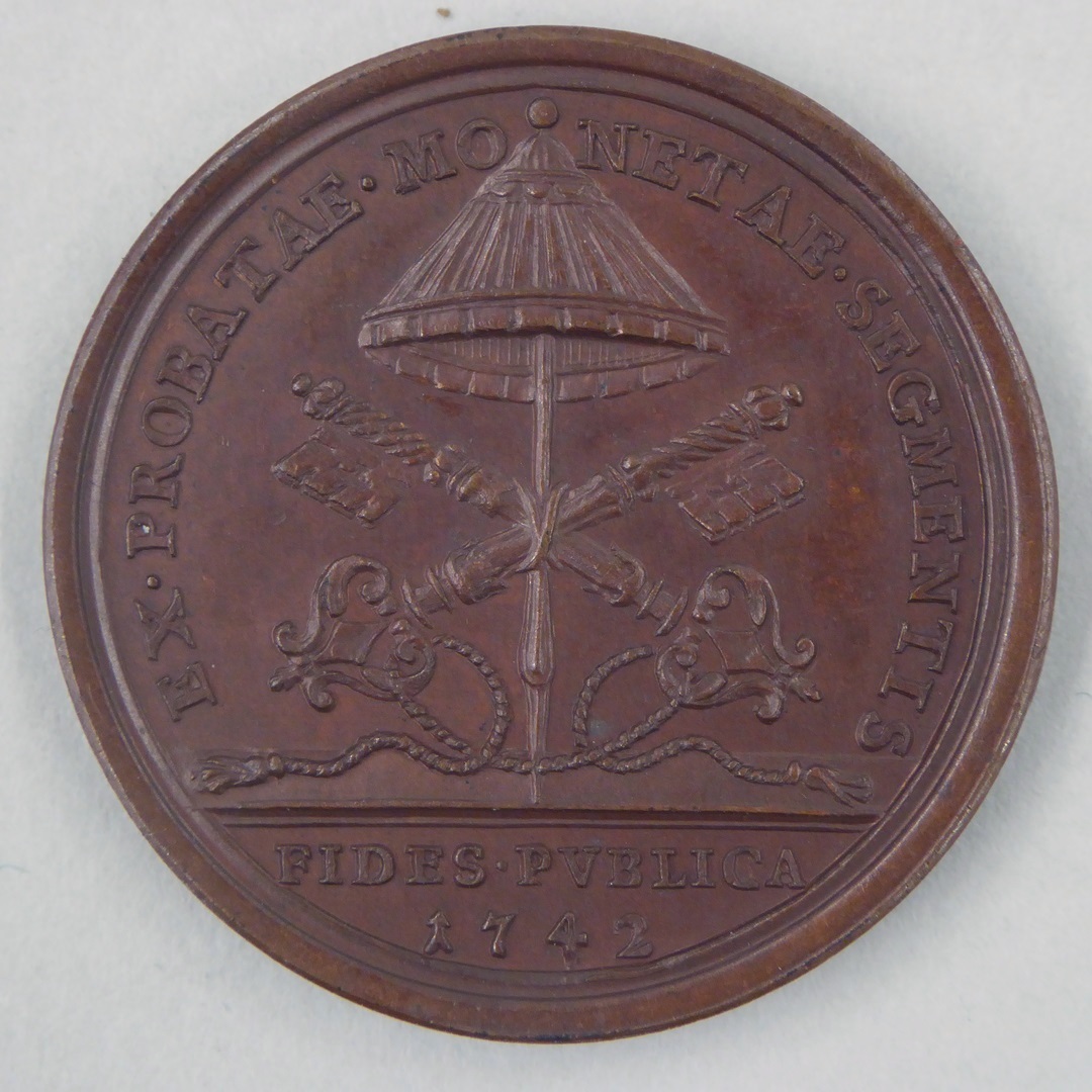 Pauspenning met portret paus Benedictus XIV (1740-1758), kz. sleutels St. Petrus