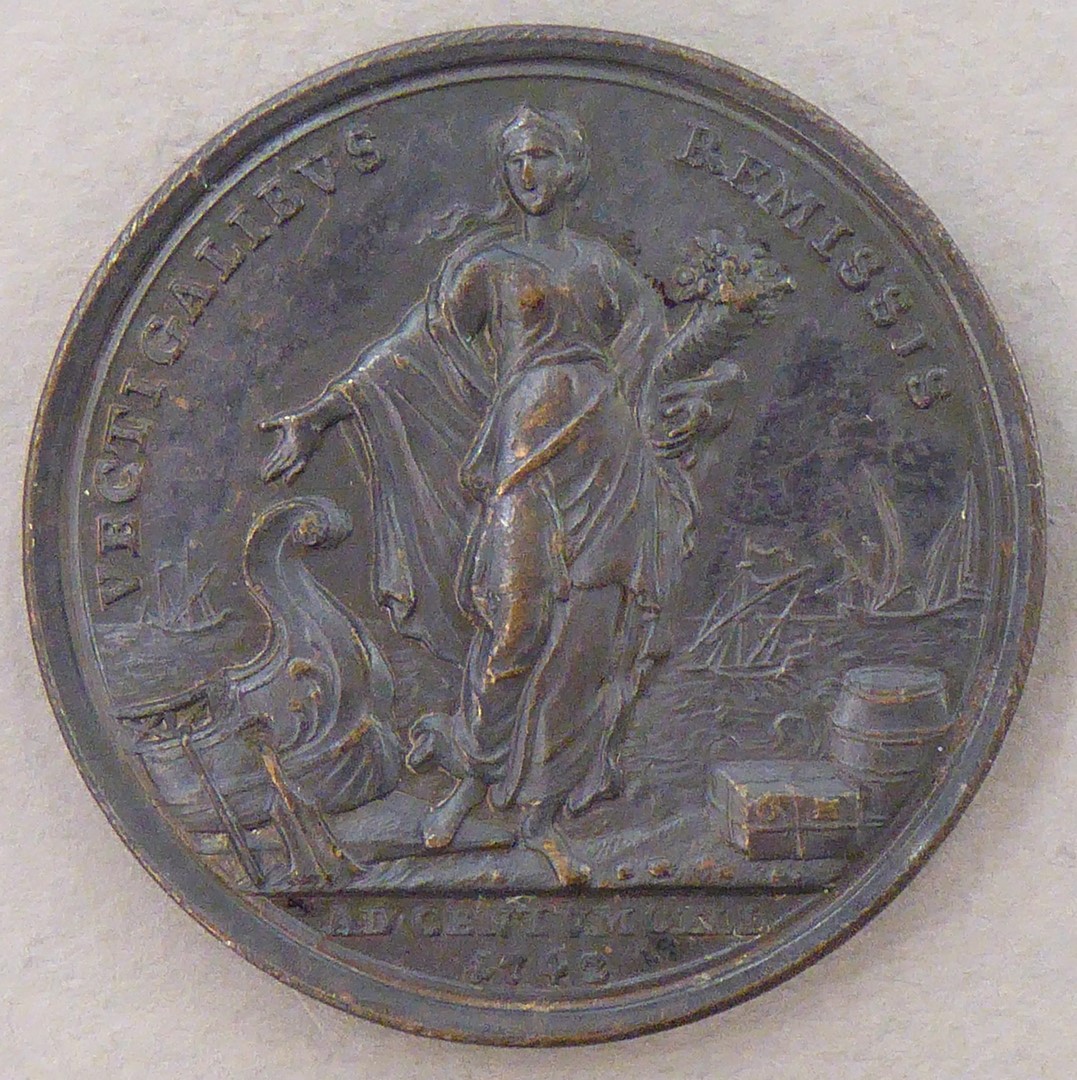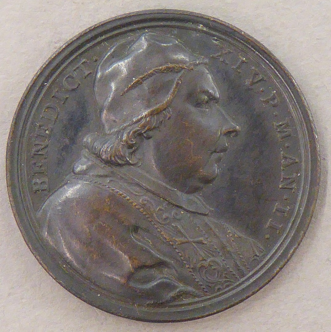 Pauspenning met portret paus Benedictus XIV (1740-1758), kz. allegorische vrouw met schip