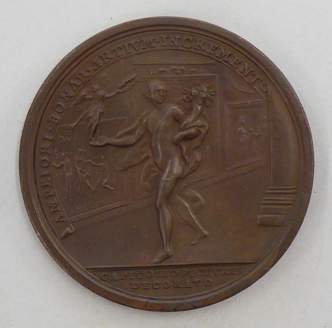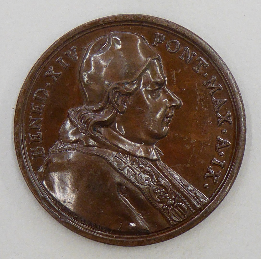 Pauspenning met portret paus Benedictus XIV (1740-1758), kz. genius schone kunsten